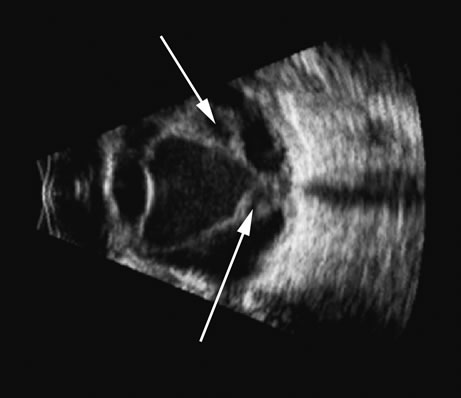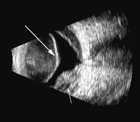 Inflammation of the vitreous can produce cellular and fibrotic conglomerates that produce echoes similar to those of hemorrhage. Differentiation is usually made on clinical grounds but may be suggested by the presence of inflammation-induced swelling of the choroid and sclera, and by the presence of a fluid layer between Tenon's capsule and the orbital fat, which is commonly seen in scleritis (Fig. 12).12 Other conditions, such as hypotony, produce identifiable thickening of the choroid and sclera. Hypotony in its later stages also produces the characteristics of the “pre-phthisic” eye, namely, shortened axial length and cyclitic membrane formation.13 |