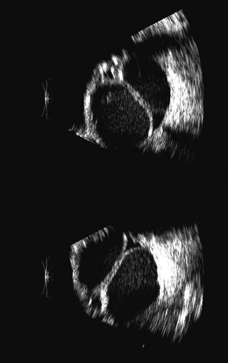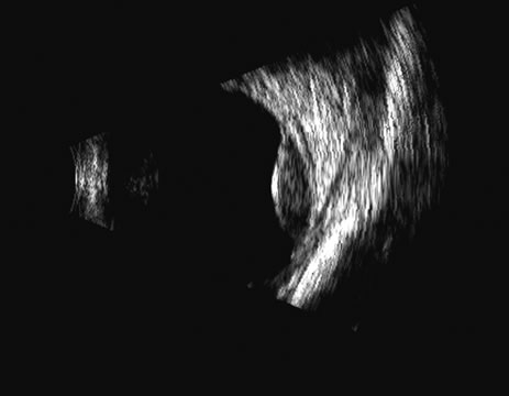 of these features of a PLM are demonstrated in Figure 7, whereas Figure 8 shows a typical detached retina. Hemorrhage shows good echogenic properties and presents a typical highly reflective vitreous body (Figs. 9 and 10). Asteroid hyalosis may resemble a vitreous hemorrhage except that the individual calcium deposits are even more reflective than hemorrhage and usually there is a clear anechoic zone between the retina and the retracted primary vitreous (Fig. 11). Synchysis scintillans is another condition with highly reflective regions in the vitreous due to cholesterol crystals. It is identifiable by the kinetic scan pattern of floating “snowflakes” that settle when the eye stops moving, just like the snowflakes in a child's snow globe. Since the “normal” vitreous is usually dissolved in this condition, the echoes come to rest on the retinal surface when the eye stops moving. An area or region of attachment of presumed vitreous to the ocular wall can be seen with kinetic scans and may indicate an area of stress or possible retinal tear. In diabetic retinopathy with proliferative membranes, the vitreous is often attached to a membrane, producing a typical cross-shaped elevation on a scan through the long axis of the proliferans. Right-angle or three-dimensional scans show the folded nature of the retinitis proliferans membrane (see Fig. 13). |