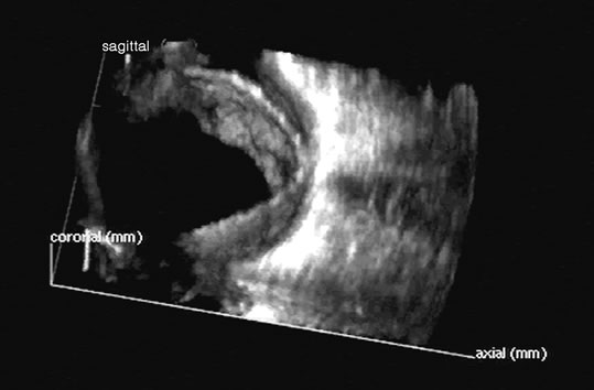 to the nerve (Fig. 14).14 Two-dimensional scans through complex three-dimensional structures, such as preretinal membranes and proliferative membranes, can be confusing unless mapped with three-dimensional conceptualization techniques. Bronson and colleagues15 have emphasized three-dimensional thinking. Although new digital three-dimensional ultrasound systems allow direct volume visualization, it remains useful to understand the technique of conceptualizing three-dimensional structures from individual sections.16 Preretinal membranes (Fig. 15), which may resemble traction detachments in thickness and reflectivity, can often be identified by turning the scan plane of the B-scanner at right angles: the disciform retinal elevation is still seen while the linear nature of a traction sheet is revealed.17 A three-dimensional rendering of a retinal detachment can directly show the conformation of three-dimensional structures (Fig. 16), and images of individual planes can be perceived. Schisis can be difficult to differentiate from a peripheral detachment based on echo amplitude, but may be suspected based on location and other clinical factors, such as age and symptomatology. Schisis is usually convex and may have lower amplitude than a retinal echo. |