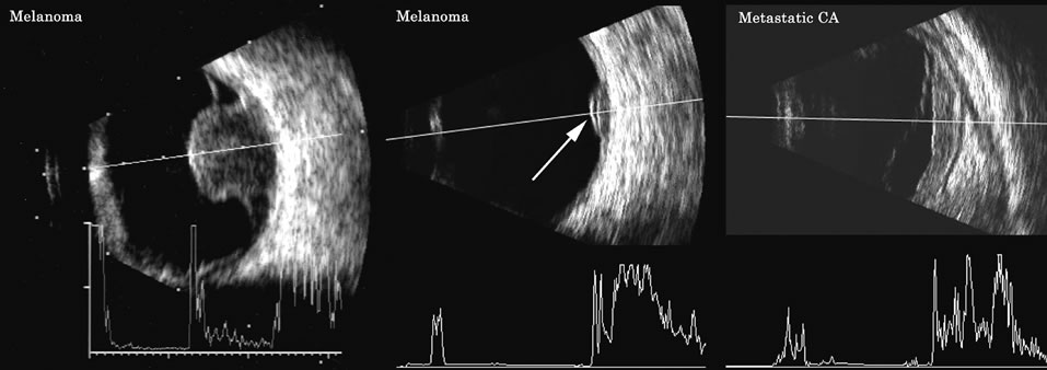 Malignant melanoma varies in its ultrasound presentation from a relatively homogeneous to heterogenous lesion on B-scan. The typical uveal melanoma absorbs sound so that the posterior section is relatively less echoic than the anterior aspect, producing a gradually decreasing amplitude, often to baseline on the A-scan (Fig. 21).