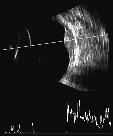 that can be managed properly only after accurate diagnosis. Advances in instrumentation, higher frequencies, and greater sensitivity and resolution have resulted in a continuous improvement in image quality.1 As with any imaging technique, familiarity with the principles and physics of the methodology is necessary to properly recognize the advantages as well as limitations of the technique in a given clinical setting and to minimize difficulties in interpretation of the image. The primary tool for ultrasound evaluation is the use of gray-scale B-scan to delineate tissue boundaries. Ophthalmic ultrasonography remains one of the few areas of medical ultrasonography in which A-scan continues to be used to further differentiate tissue characteristics, such as membrane, retina, tumor, and cyst. Improved B-scan gray scale has reduced some of the advantages of A-scan, but A-scan is still necessary for quantifying echo amplitudes, particularly when distinguishing vitreous membranes from retina or identifying tumor types.2,3 In general, ophthalmic diagnostic ultrasound systems continue to use single-element 10 MHz mechanical sector scan probes to provide the best quality two-dimensional B-scan image.2 The cost of high-end array technology available with “mainframe” ultrasound units is typically prohibitive in ophthalmic practice. In addition, the array and dynamic focusing characteristics of typical small-parts probes are not currently optimized for ophthalmic geometries. Very high frequency ultrasound uses frequencies in the range of 35 to 100 MHz to show greater detail of the anterior segment.4 Penetration is limited for these higher frequencies to only a few millimeters; thus, only the anterior vitreous behind the ciliary body and lens can be imaged. Frequencies of up to 20 MHz can be used for posterior pole evaluation of the retina and choroid. |