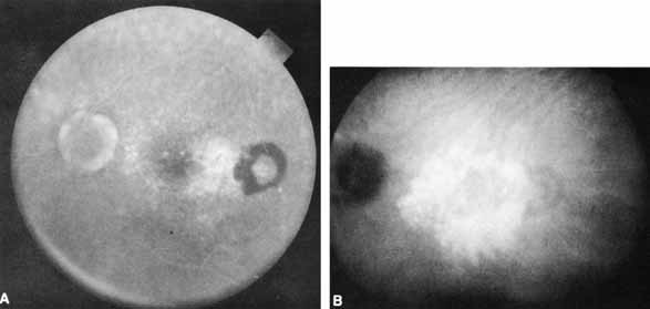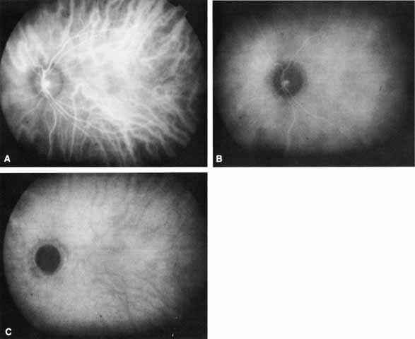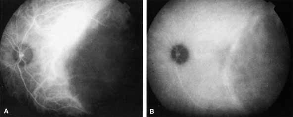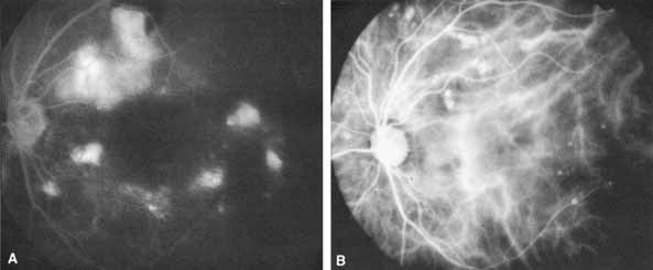 In general, the most promising clinical application of ICGA is as an adjunct to FA in the diagnosis and management of exudative age-related macular degeneration (AMD).2–4,11,12,13 ICGA may also be of value in evaluating other choroidal-based pathologic processes, such as choroidal tumors, central serous chorioretinopathy, and choroidal inflammatory or degenerative diseases.9 ICGA has been used in various ways to study choroidal vascular flow, and the technique, in general, may be helpful in elucidating the pathophysiology of diseases involving the choroidal vasculature.8,37,39–43 |