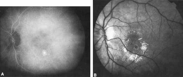 hyperfluorescent artifact. In general, laser treatment directed at abnormal ICG lesions should be performed only when there is a reasonable degree of certainty that the lesion identified is the source of the clinically apparent exudative manifestations. ICG abnormalities far outside the area of exudative signs or in the absence of exudative signs should be closely observed.44 |
