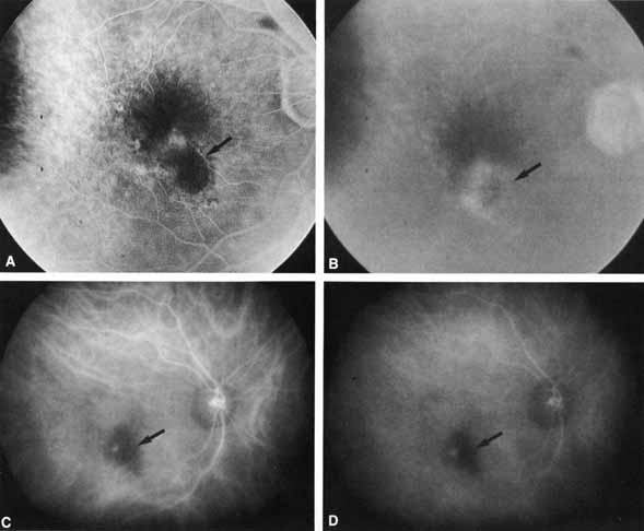 hypofluorescence in all phases of the angiogram. The large, underlying