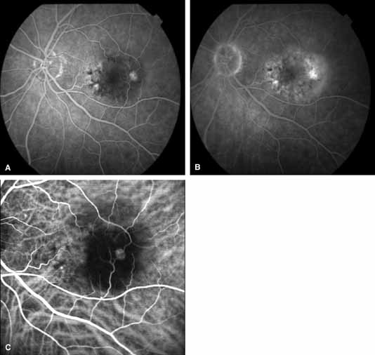 PATHOPHYSIOLOGY OF CHOROIDAL NEOVASCULARIZATION In AMD, it has long been postulated that focal choroidal ischemia may play a role in the development of CNV. Macular choroidal vascular “watershed” zones have been known to exist, but their causal relationship to CNV has never been determined. On ICG angiography, these presumed watershed zones appear as areas of relative, abnormal hypofluorescence in the early phases of the angiographic study.44 A published ICGA analysis by Ross et al.45 revealed a much higher incidence of the presumed watershed zones in the macula of eyes with AMD compared with age-matched control eyes (55% vs. 15%, respectively). Furthermore, Goldberg et al.46 found that 92% of eyes that developed choroidal neovascular membranes had watershed zones. These data support the notion that watershed zones play a role in CNV development and that ICG angiography may be useful once again in identifying eyes at the highest risk for the exudative transformation. Other studies have shown that ICGA can distinguish the different types of drusen and, therefore, may be useful to evaluate the risk of progression of AMD.47 CLASSIC CHOROIDAL NEOVASCULARIZATION Classic CNV as determined by FA shows a similar appearance on ICGA with well-defined hyperfluorescence throughout the transit phase and leakage obscuring the borders of the lesion in the late frames. However, the leakage in the late frames tends to be less pronounced with ICGA. Overall, ICGA offers no advantage over fluorescein angiography in this setting. OCCULT CHOROIDAL NEOVASCULARIZATION Occult CNV assumes a variety of FA patterns.48 There can be obscuration of the neovascularization from fluorescein blockage by overlying fluid or pigment or from rapid leakage of the dye in the area of interest. Sometimes there is slow, irregular fluorescein leakage with poorly delineated borders. With occult CNV, there may be varying degrees of uncertainty as to the precise location and extent of the choroidal neovascular membrane using FA alone. Both fluorescein and ICG dyes appear to be retained by CNV and will, therefore, exhibit hyperfluorescence relative to surrounding tissue.1 ICGA theoretically provides enhanced visualization of CNV in this setting because the ICG infrared fluorescence better penetrates pigment and fluid than the visible light fluorescence of sodium fluorescein, and the highly protein-bound ICG dye leaks less from abnormal vessels compared with fluorescein dye as described earlier. Several patterns of ICG hyperfluorescence for occult CNV have been observed.4,11,49,50 These include early-appearing small hyperfluorescent spots (hot spots), plaque-like hyperfluorescence, collections of abnormal vessels, and late-appearing hyperfluorescence with indistinct edges (Figs. 3, 4, and 5). A combination of these patterns can be seen. Although thin blood is easily penetrated by the infrared fluorescence (Fig. 6), thick blood will still obscure the underlying choroidal pattern to some degree. Reichel et al.51 demonstrated that ICGA was superior to fluorescein angiography in determining the extent of CNV secondary to age-related macular degeneration obscured by hemorrhage. Several investigators have demonstrated the ability of digital ICG angiography to not only confirm, but also better delineate CNV in certain cases of exudative AMD.1,3,4,10–13,33 Early large series by Yannuzzi et al.4,52 and Regillo et al.,11 using digital videoangiogram systems demonstrated well-defined hyperfluorescent foci of ICG presumably corresponding to the entire choroidal neovascular process in approximately 40% of cases, where FA revealed occult or ill-defined CNV only (see Figs. 3, 4, 5, and 6). A similar yield was reported early on by Kuck et al.,13 using SLO-based ICGA. Furthermore, studies by Regillo et al.,11 Sorenson et al.,53 and Guyer et al.54 have shown that laser photocoagulation of well-defined ICG hyperfluorescent foci with treatment guided solely by the ICGA findings resulted in short-term resolution of exudation and stabilization or improvement of vision in 56% to 69% of cases. Although prior studies with AMD patients have shown that occult or ill-defined CNV on FA have, in general, a poor visual prognosis,55,56 adequate controls are not available to determine whether laser therapy as outlined in these studies significantly altered the natural history. Nonetheless, the data suggest that treatment based on ICGA findings may result in prompt resolution of exudation and improved visual acuity in selected cases. Therefore, this technique has the potential to increase the yield of exudative AMD cases that may be effectively managed by conventional laser photocoagulation treatment methods. SERIOUS PIGMENT EPITHELIAL DETACHMENTS In contrast to the bright hyperfluorescence on FA, serous pigment epithelial detachments most often appear either isofluorescent or slightly hypofluorescent; associated hyperfluorescent CNV is, therefore, more easily seen on ICGA (Fig. 7). In AMD, a serous pigment epithelial detachment (SPED) is usually associated with CNV. However, the CNV may not be adequately visualized with fluorescein angiography because of rapid fluorescein pooling into the sub-pigment epithelial space. With ICGA, the neovascular component shows a relative hyperfluorescence, whereas the serous component of the complex is isofluorescent or hypofluorescent due to the minimal amount of ICG leakage(Fig. 7) It was initially hoped that this would lead to an increased yield of successful laser treatment of such lesions. Baumal et al.57 demonstrated that ICGA revealed CNV associated with SPED in 83% of eyes in which the CNV was not well delineated by fluorescein angiography. However, laser treatment to the presumed neovascular focus as guided by the ICGA findings did not change the visual outcome compared to controls. Lim et al.58 showed a transient stabilization of visual acuity following ICGA-guided laser photocoagulation for CNV associated with SPED. Ho
