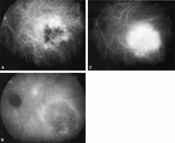 time. As expected, the different patterns of fluorescence of these tumors appear to reflect their different choroidal vascular architecture with only minimal or no leakage of the ICG dye. Choroidal hemangiomas consistently exhibit a relatively unique fluorescence pattern, and ICGA may be a helpful test in differentiating these lesions from potentially simulating tumors, such as amelanotic choroidal melanomas and choroidal metastases.87 How ICGA compares with other diagnostic tests, such as FA and ultrasonography, in terms of sensitivity and specificity in this area is not known. Further investigation is needed to better assess its clinical utility in this area. |