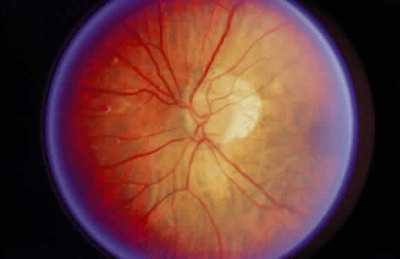 Reflection from the surface of the retina during ophthalmoscopy is attributable to the presence of a normal internal limiting membrane, a true basement membrane, secreted by the Müller cells. Loss of this reflection may indicate pathologic changes at the level of this structure (Fig. 3), such as a preretinal membrane (see Fig. 3). The color of normal retinal blood vessels depends on the composition of the blood column and the transparency of the blood vessel wall. The color of the normal vessels is altered in states of poor oxygenation (pulmonary diseases), extremely elevated lipid levels (lipemia retinalis) (Fig. 4), or opacification of the blood vessel wall, as seen in arteriolosclerosis (Figs. 5 and 6).