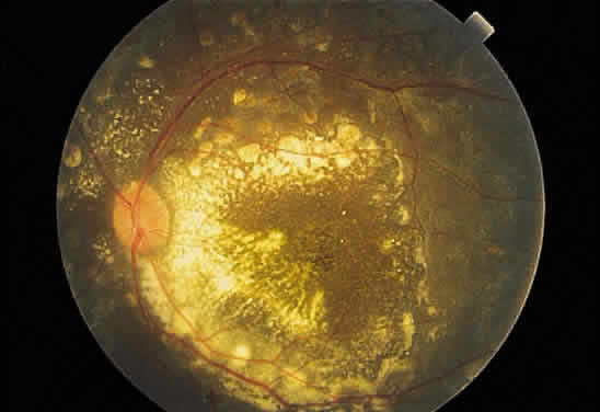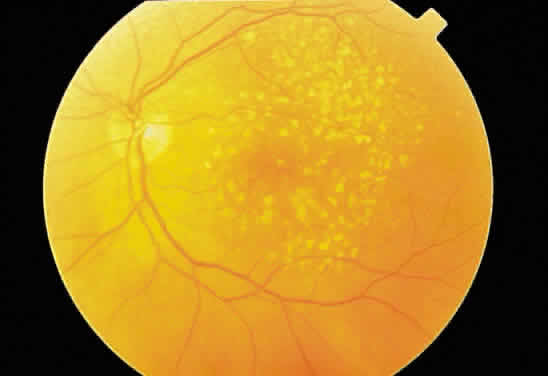 When an exudate is present in a ring configuration outside of the macula, the vascular disease is most commonly found within the ring. Retinal macroaneurysm is an example (Fig. 45) of a focal retinal vascular lesion surrounded frequently by exudate.