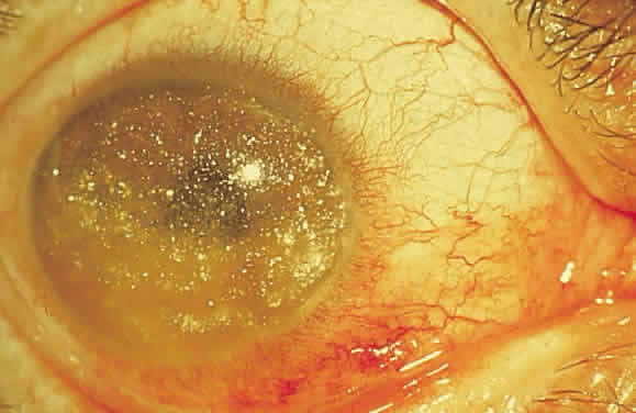 YELLOW CHANGES IN THE FUNDUS The accumulation of lipid usually accounts for yellow deposits in the fundus. Lipid may be derived from degenerated cells such as senescent erythrocytes or from exudation. In the case of hemorrhage, the plasmalemma of red blood cells frequently contributes to the formation of cholesterol deposits, leading to the clinically observed condition of cholesterolosis bulbi. The cholesterol crystals may be seen in the vitreous by ophthalmoscopic examination or in the anterior chamber by slit-lamp examination (Figs. 38 and 39). (Parenthetically, another byproduct of cell membrane degradation can accumulate in the retinal pigment epithelium and appear orange. Lipofuscin results from the accumulation of “residual bodies,” the residua of phagolysosomes that have digested intracellular debris. This orange color may be seen over the surface of choroidal nevi and especially melanoma.13)