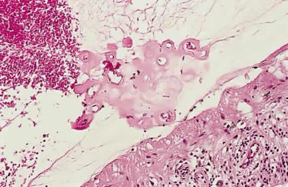 Occasionally, accumulations of inflammatory cells may appear white even in the absence of necrosis. Sheathing around retinal vessels (including the “candle wax drippings” seen in retinal sarcoid) represents a perivascular accumulation of inflammatory cells. Roth spots, which are white-centered hemorrhages, as seen in patients with bacterial endocarditis, are thought to represent the abscess within the hemorrhage. White-centered hemorrhages may occur in other conditions, and the explanation for the white center ranges from accumulations of leukemic cells to cytoid bodies. Duane and associates found fibrin and platelet aggregates in several patients with white-centered hemorrhages of various etiologies.11 Granulomatous inflammatory deposits often appear yellow to yellow-white, the clinical appearance of the Dalen-Fuchs nodule of sympathetic ophthalmia. Structures in the fundus may calcify, but the resultant white changes typical of calcium may be difficult to discern ophthalmoscopically because of the location of the calcium, viz., drusen of the optic nerve head. These calcific concretions are buried within the substance of the optic nerve head, usually anterior to the lamina scleralis (Fig. 28). They are covered by axonal and glial tissue together with the vascular supply of the nerve head. They are recognizable because of distortions in the shape of the disc, not the characteristic white color of the calcified lesion (Fig. 29). Drusen of the optic nerve head must not be confused clinically with papilledema (Figs. 30 and 31), with so-called “giant drusen,” which are glial hamartomata, or with drusen of the pigment epithelium, which are deposits of basement membrane material between the pigment epithelium and Bruch's membrane.