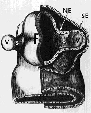 stage. The optic vesicle is composed of neural ectoderm and is surrounded by surface ectoderm (see Fig. 1). At about the 5-mm stage, both vesicles invaginate, and the outer wall of each becomes the inner wall of the newly formed concavity, the optic cup (Fig. 2). This inner wall of the optic cup (the former outer wall of the optic vesicle) gives rise to the retina, and the outer wall of the optic cup forms the retinal pigment epithelium (RPE). As the optic vesicles invaginate to form the optic cups, a groove remains open on the inferior aspect of each (see Fig. 2). Known as the embryonic fissure, this opening is the pathway by which the mesodermal tissue, which gives rise to the intraocular vascular supply, enters the globe. Mesodermal tissue also surrounds the optic vesicles and eventually forms the choroid. Apparently, the choroid develops only in areas where the mesoderm is in contact with the RPE. This concept is supported by the clinical fact that in eyes with a retinochoroidal coloboma secondary to faulty closure of the embryonic fissure, the choroid, as well as the RPE, fails to develop properly. Closure of the embryonic fissure begins centrally and is normally complete at about the 13-mm stage (5 to 6 weeks). The earliest recognizable structure associated with the optic disc is the primitive epithelial papilla. This is simply an accumulation of cells from the inner layer of the optic cup that surrounds the superior end of the embryonic fissure. At or about the 17-mm stage, nerve fibers grow from the retinal ganglion cells through the primitive epithelial papilla into the optic stalk, and the optic nerve is thus formed. The first vascular supply to the globe enters through the embryonic fissure as the hyaloid artery at about the 5-mm stage. Derived from the carotid artery, this vessel forms a network (vasa hyaloidea propria) that vascularizes the primary vitreous. The vasa hyaloidea propria is maximally developed at about the 40-mm stage (third month of gestation) and regresses, until even the intraocular hyaloid artery itself usually is gone at about the eighth month of gestation. The portion of the hyaloid artery running within the optic nerve becomes the central retinal artery within the nerve. Developmentally, the retinal vascular system does not appear to arise directly from the hyaloid artery. The most widely accepted concept has been summarized by Ashton, who states that at about 15 to 16 weeks of gestation (100-mm stage), mesenchymal cells appear on the optic disc adjacent to the hyaloid artery.3 Cords of these cells invade the superficial retina and differentiate into endothelial cells, which form capillaries. At this time, it is not possible to make a distinction between arteries and veins. In turn, the capillaries undergo a process of remodeling, and the retinal arteries and veins are formed. |