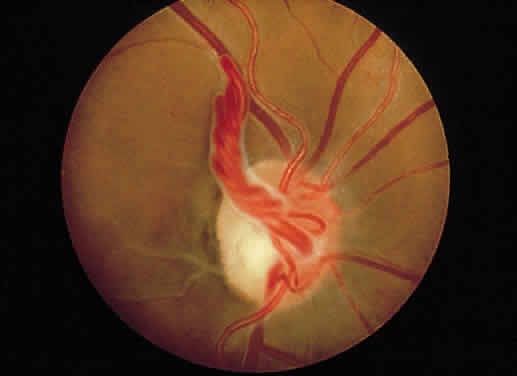 PREPAPILLARY VASCULAR LOOPS Prepapillary vascular loops are blood vessels that project from the optic disc into the vitreous cavity and then return to the disc to continue their natural course. First described by Liebrich in 1871,4 over 90 cases have since been reported.5 The loops have at least one ascending and one descending limb, and 85% to 95% are arterial in origin. Occasionally, an arterial loop projects from the disc and returns to the retina, whereas its venous counterpart may arise from the retina and exit into the disc. Rarely, a loop arises from the retina and returns to the retina; this particular anomaly has been termed a preretinal vascular loop.6 The vessels may appear as simple hairpin loops (180° turns), in a figure eight, or in a corkscrew configuration. In about 30% of cases, the loop is surrounded by a white, glial-appearing sheath7 (Fig. 3). The average arterial loop extends approximately 1.5 mm into the vitreous cavity, probably within Cloquet's canal; the largest loops reach about 5 mm in height.8 Venous prepapillary loops usually are less elevated.9 In contrast to persistent hyaloid arteries, prepapillary vascular loops have not been observed to extend as far anteriorly as the posterior lens capsule.