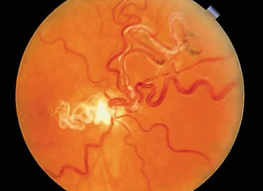 A persistent hyaloid artery may be found in association with persistent hyperplastic primary vitreous20,21 and should be considered a possible complicating factor during surgery.22 Indeed, intraoperative diathermy of a persistent hyaloid artery has been reported to result in a branch retinal artery occlusion.23 A persistent hyaloid vascular system also has been reported to occur in association with retinopathy of prematurity, potentially complicating surgical repair.24,25 Prepapillary and vitreous hemorrhage has been seen in association with persistent hyaloid arteries.22,26–28 Aside from those cases associated with ocular trauma, the mechanism of hemorrhage is unknown.29 RETINAL MACROVESSELS Retinal macrovessels are abnormally large single blood vessels, usually veins, which traverse the macular region and supply or drain the retina both inferior to and superior to the horizontal raphe (Fig. 5). This aspect of blood supply or drainage is unusual because only about 1% of eyes have a retinal vessel that extends to any degree on both sides of the horizontal raphe.30 Relatively large branches from these vessels may penetrate the foveal region, and small branches occasionally are seen traversing the foveal avascular zone. The aberrant retinal vessel is congenital and usually unilateral. Surprisingly, most eyes with this abnormality have normal visual acuity and are detected on routine examination.31,32