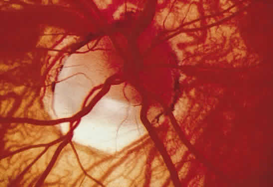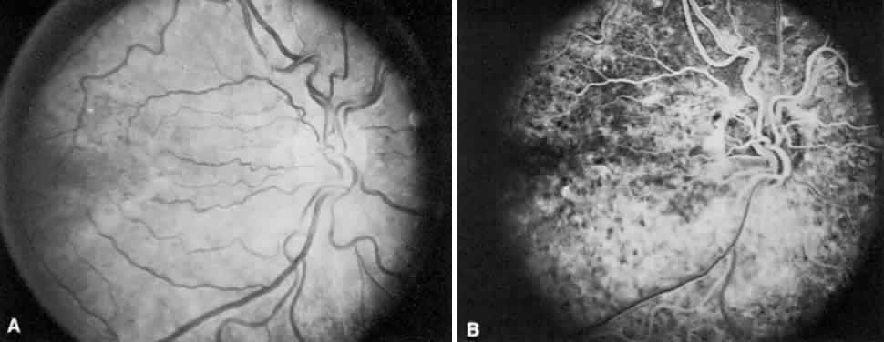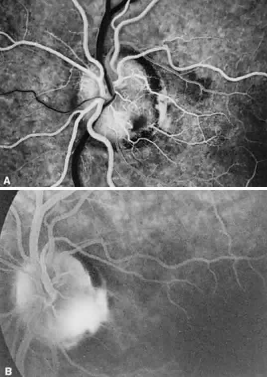 Cilioretinal arteries usually supply only a small portion of the fundus and are mostly confined to the macula. In about 1 eye in 2900, a cilioretinal artery may supply a major part of the fundus.45 However, when prepapillary arterial loops are present, prominent cilioretinal circulations are commonly seen.8,46 Cilioretinal arteries supply the foveal region in about 10% of eyes.47 This is clinically relevant in that such a cilioretinal vessel may preserve central vision in eyes that sustain a central retinal artery obstruction.47 The presence of a temporal cilioretinal artery also has been correlated with increased retention of central visual field and visual acuity in eyes with advanced open-angle glaucoma.48 Conversely, cilioretinal arteries also may become obstructed and produce a central field defect.49 In general, isolated cilioretinal artery obstruction carries a favorable visual prognosis with 90% of eyes achieving a visual acuity of 20/40 or better.50 Cilioretinal artery obstruction also may occur in association with central retinal venous obstruction or ischemic optic neuropathy.50,51 Central retinal vein occlusion is thought to raise intraluminal resistance in the cilioretinal artery and subsequently cause occlusion.52,53 Other investigators have documented abnormal central retinal artery inflow by intravenous fluorescein angiography in patients with this disorder.54 These eyes have a less favorable prognosis, with 70% of eyes achieving a visual acuity of 20/40 or better.50 A cilioretinal artery obstruction occurring in the setting of ischemic optic neuropathy may be explained by the shared origin of their vascular supply.51 These eyes have the worst prognosis, with no eyes achieving better than 20/40 visual acuity.50 Cilioretinal artery obstructions account for about 5% of arterial obstructions in the retina.47,55 |