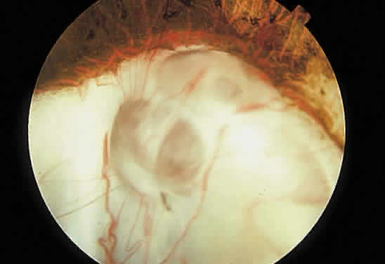 Embryologically, prepapillary loops are thought to occur at about the 100-mm stage, when the retinal vessels are developing. For an unknown reason, a vessel probably grows into Bergmeister's papilla, which is maximally developed at about the 180-mm stage, and then returns to the retina. It has been proposed that the loop requires Bergmeister's papilla as a scaffold for growth. Thus, its growth is limited, since Bergmeister's papilla usually does not extend more than one third of the distance into the vitreous cavity. Prepapillary loops are rare; the incidence ranges from 1 in 2000 to 1 in 9000 patients.8,10 Bilaterality occurs in about 9% to 17% of cases of arterial loops, but the percentage with venous loops is uncertain. Arterial prepapillary loops most commonly supply the inferior retinal vascular system, in contrast to venous prepapillary loops, which usually drain the superior retinal vascular system.11 On fluorescein angiography, prepapillary loops demonstrate a rapid flow. However, there may be a sector delay in filling of the optic disc or the area of retina supplied by the loop caused by the increased distance that blood must travel through the loop. Cilioretinal arteries have been seen in up to 75% of eyes with prepapillary loops.8 Ocular complications associated with prepapillary vascular loops include branch retinal artery obstruction in the area of retina supplied by the loop,8,12 amaurosis fugax, and vitreous hemorrhage.8,13,14 Presumably, kinking of the loop and impairment of blood flow dynamics in some way contributes to the obstruction. Why vitreous hemorrhage occurs is uncertain, although we have noted it to occur in conjunction with acute posterior vitreous detachment. No consistently associated systemic abnormalities have been found in conjunction with prepapillary loops. The differential diagnosis of arterial prepapillary loops includes persistent hyaloid artery. However, the latter is only a single vessel, without ascending and descending branches. Congenital venous prepapillary loops must be differentiated from the acquired variety.15 Congenital loops usually are single and unassociated with other ocular abnormalities, whereas acquired venous loops often are multiple and seen with disease entities such as retinal venous obstruction and optic nerve tumors.16 PERSISTENT HYALOID ARTERY The hyaloid artery enters the globe through the embryonic fissure at about the 5-mm gestational stage. It branches throughout the vitreous cavity to form the vasa hyaloidea propria, the vascular supply of the primary vitreous. Additionally, it contributes to the tunica vasculosa lentis to supply blood to the developing lens.17 Maximally developed at about the 40-mm stage (9 weeks), the vasa hyaloidea propria begins to regress at the 60-mm stage (11 weeks). The hyaloid artery becomes impervious to blood at about 7 months, and the end of the involutional process usually occurs during the eighth month of fetal life, at which time the intravitreal artery becomes atrophic.18 The sequence of regression is such that the vasa hyaloidea propria regresses first, followed in turn by the capillaries of the tunica vasculosa lentis and then the hyaloid artery.19 The hyaloid artery can be seen in premature infants, and occasionally the vessel persists into adult life. Ophthalmoscopically, a persistent hyaloid artery appears as a single vessel extending from the optic disc anteriorly through Cloquet's canal. It may be filled with blood but usually is bloodless after birth and can extend as far anteriorly as the posterior capsule of the lens (Fig. 4). Usually, the insertion on the posterior capsule is located inferonasal to the visual axis. Occasionally, after the vessel has regressed, only the circular point of insertion remains; this is known as a Mittendorf dot.