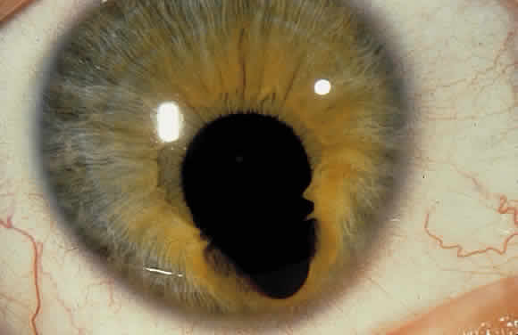 No hereditary tendency is evident, and no associated intrauterine insults have been identified. Basal encephalocele and pituitary hormone disturbances have been described in conjunction with the abnormality.140–143 The etiology of the anomaly is uncertain, although the association of a morning glory optic disc with persistent hyperplastic primary vitreous has been noted.144,145 Optic nerve dysplasia is the term that has been applied to the morning glory disc anomaly when the center is elevated rather than excavated. This variant also has been associated with basal encephalocele.146 PERSISTENT BERGMEISTER'S PAPILLA Bergmeister's papilla arises from the cells that constitute the primitive epithelial papilla. These neuroectodermal cells proliferate until they are maximally developed, at about the 180-mm stage (5 to 6 months). At this time, they form a glial sheath around the proximal one third of the hyaloid artery. The sheath begins to atrophy during the seventh month of intrauterine life, and the point to which it regresses determines the character of the physiologic cup. Failure of complete regression produces a persistent Bergmeister's papilla. Ophthalmoscopically, a persistent Bergmeister's papilla appears as minimally clustered white tissue overlying the optic disc. It may be associated with absence of the physiologic cup and with congenital anomalies such as prepapillary vascular loops. COLOBOMA Colobomas are congenital or acquired notches, fissures, or defects that are found in the eye. Most commonly, they are congenital and occur secondary to faulty closure of the embryonic fissure. The optic nerve alone may be involved, or, more often, the anomaly may be of the retinochoroidal variety. Isolated optic nerve colobomas appear as excavations within the nerve head and can range up to 25 D in depth and 0.9 disc diameters across.147 They may be unilateral or bilateral, and an autosomal dominant heredity pattern has been described in some patients.147 Despite their presence, visual acuity may be good. However, there is an associated nonrhegmatogenous retinal detachment in 8% to 50% of patients, and this can substantially decrease the vision.147,148 Some optic nerve colobomas have glial tissue filling the cup, similar to the morning glory anomaly.147 Whether some morning glory discs represent an aberrant form of optic disc coloboma is uncertain.149–151 Retinochoroidal colobomas are glistening white or yellow defects with distinct borders that occur inferior or inferonasal to the optic disc (Fig. 12). They may extend up to and involve the optic disc (Fig. 13), or they may be seen as isolated chorioretinal defects. The margins of the coloboma often are pigmented, and the defect is filled with abnormal retinal tissue. Anteriorly, the defect can extend as far as the iris and produce an inferonasal gap (Fig. 14). These anomalies may occur in otherwise normal persons or in association with chromosomal abnormalities or multisystem diseases, such as trisomy 13, the Aicardi syndrome, Goldenhar's syndrome, and the CHARGE association.148,152,153 Occasionally, autosomal dominant or recessive inheritance patterns are found, but often none are evident.152 In families with autosomal dominant inheritance, variable expression of the genetic trait makes genetic counseling difficult.154