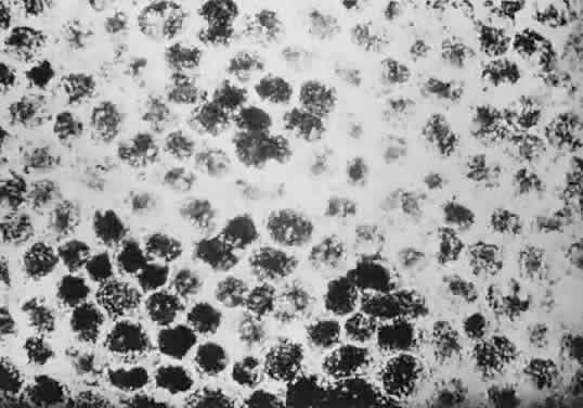 Histologically, the involved RPE cells are taller and contain a greater concentration of pigment granules (which may be enlarged) than normal RPE (Fig. 21). The overlying retina has been shown to be unaffected in one patient.171 Congenital hypertrophy of the RPE and grouped pigmentation of the retina may be different expressions of a similar condition, the latter being multifocal, rather than unifocal.172 Both conditions are asymptomatic and, probably rarely, if ever, affect the central visual acuity. A variant of grouped hypertrophy of the RPE has been associated with familial adenomatous polyposis and Gardner's syndrome.173,174 This entity is similar to grouped hypertrophy of the RPE except that the lesions are more likely to be bilateral, randomly distributed throughout the fundus, and have irregular borders.175 ALBINISM Albinism is a congenital condition characterized by faulty development of melanin pigment. It can occur as oculocutaneous (generalized) albinism, in which the skin, hair, and eyes are affected, or as ocular albinism, in which only the eye is involved. Generalized albinism occurs in about 1 in 20,000 people.176 It is thought to be an autosomal recessive disorder and can be seen in tyrosinase-negative and tyrosinase-positive forms. However, normal offspring have been described from parents who both have oculocutaneous albinism.177 Normally, tyrosine is converted to dopa in the pathway of melanin biosynthesis. Tyrosinase is an essential enzyme that catalyzes several steps in this conversion. In the tyrosinase-deficient form of albinism, hair bulbs incubated with tyrosine cannot form melanin, implying that the abnormality occurs secondary to a deficient catalytic activity of tyrosinase.178 In the tyrosinase-positive variety, melanin can be formed by incubation of hair bulbs with tyrosine. Tyrosinase is present in this variety, and the defect is thought to result from abnormalities of the “P” polypeptide, a melanosomal tyrosine transporter.178 Tyrosinase-negative albinism affects visual acuity most severely, with most patients falling into the 20/200 to 20/400 (6/60 to 6/120) range. These patients usually have photophobia, nystagmus, no fundus pigment, and light irides that transilluminate (Fig. 22). The tyrosinase-positive form is less severe; these patients also have nystagmus and photophobia, but visual acuity may be better, and some pigmentation may be present.179,180