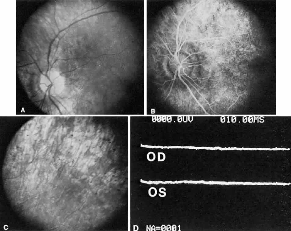 RUBELLA RETINOPATHY In 1941, Gregg described the triad of cataracts, deafness, and congenital heart disease in infants born to mothers who had experienced rubella during pregnancy.192 However, he attributed the first observation of fundus pigmentary changes to Mitchell in 1939. The ocular manifestations usually occur secondary to infection during the first trimester of pregnancy, and it has been estimated that the chances of the fetus being involved secondary to infection at this time are greater than 50%.193 Retinopathy is the most common ocular manifestation of congenital rubella, followed in frequency by strabismus and cataract.193 It is characterized by a diffuse pigmentary disturbance (salt-and-pepper retinopathy), often more prominent on fluorescein angiography than ophthalmoscopically (Fig. 24). Usually, it is bilateral, but this is not always so.193,194 The visual acuity in eyes with retinopathy unaccompanied by cataracts or glaucoma usually is 20/20 to 20/60 (6/6 to 6/18), with a median of about 20/25 (6/7.5). Although it was formerly believed that the retinopathy was not progressive and affected the vision only mildly, several cases have been described in which a subretinal neovascular membrane developed and decreased the acuity to the 20/200 to 20/400 (6/60 to 6/120) range.195–199 In addition, affected eyes should be carefully examined for the signs of late-onset glaucoma.200 Importantly, the electroretinogram usually is normal with this disease.201 LEBER'S CONGENITAL AMAUROSIS Leber's congenital amaurosis accounts for about 10% of congenital blindness and at least 5% of all inherited retinal dystrophies.202,203 The fundi may be normal in this bilateral disease, but when they are abnormal, they include diffuse pigmentary stippling, pale optic nerves, or both (Fig. 25A through C). Blond fundi also may be seen. Other ocular associations may include cataracts, nystagmus, and hyperopia.204,205 The children are usually blind, typically with visual acuity ranging from 20/200 (6/60) to hand motions, or become so during the first year of life. Severe night blindness, and occasionally photoaversion, also is present.206 Roving eye movements may be apparent because of the poor visual acuity. The electroretinogram is crucial for making the diagnosis and is either flat or shows only minimal responses (see Fig. 25D). This disease is autosomal recessive, and it may represent a type of retinitis pigmentosa, since children with a progressive form may develop fundi identical to the typical retinitis pigmentosa fundus by the middle childhood years.205,207 It is thought that the impaired development or extremely early degeneration of photoreceptors is related to a mutation on chromosome 17, which causes impaired production of a retinal guanylate cyclase.203,208,209 MYELINATED NERVE FIBERS Myelinated nerve fibers in the retina appear ophthalmoscopically as superficial yellow or white patches that follow the course of the nerve fiber layer. Usually, the peripheral edges of the lesions are feathery, and they may be connected to the optic disc or more peripheral and separated from it by an area of normal retina (Fig. 26). The anomaly produces localized relative visual field defects, and since it rarely involves the fovea, it usually does not affect visual acuity.210 Rarely, unilateral peripapillary myelinated nerve fibers are associated with myopia, strabismus, and amblyopia.211,212 Although affected eyes have been reported to be refractory to treatment, amblyopia therapy should be considered because some patients respond to therapy.213,214 Finally, retinal vascular abnormalities ranging from mild telangiectasis to frank neovascularization may develop in a region of myelinated nerve fibers, and these vessels may result in vitreous hemorrhage.215–218