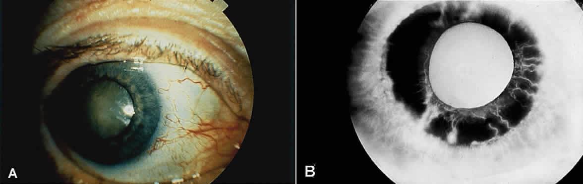Eyes with ocular ischemic syndrome appear to be at high risk for rubeosis iridis, which is found in 67% of eyes at the time of presentation1 (Figs. 1 and 2). By comparison, only 2.8% of nonischemic CRVOs, 58% of ischemic CRVOs,14 and 15% to 20% of central retinal artery occlusions will develop neovascularization of the iris.15,16 When clinicians are faced with a patient with rubeosis iridis and no obvious etiology (i.e., there are no signs of diabetic retinopathy or retinal vascular occlusion), they should consider the possibility of ocular isch-emic syndrome. The high incidence of rubeosis iridis is probably related to the combined ischemia of both anterior and posterior segments of the globe.