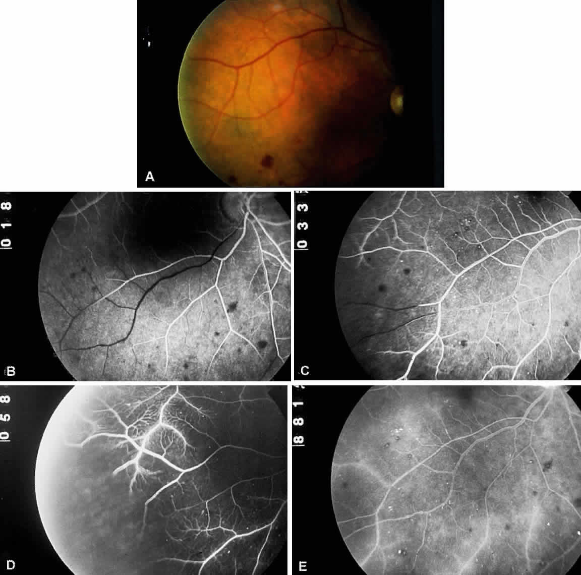 Prolonged arm-to-retina circulation times are frequently observed (Fig. 3B).24 This reflects the slower flow of blood from the carotid artery to the central retinal artery due to carotid occlusive disease. In normal persons, fluorescein dye is first detected in the retinal vasculature 12 to 15 seconds after dye is injected into the arm vein. Uncommonly, dye may take up to 20 seconds to reach the retinal arteries in a normal person. In ocular ischemic syndrome, arm-to-retina circulation times well over 20 seconds are not uncommon. The arm-to-choroid circulation time is also frequently prolonged in ocular ischemic syndrome because of the slow flow of blood from the carotid artery to the short posterior ciliary arteries. In pronounced cases, complete choroidal filling may still be lacking at 1 minute after injection. Accurate measurement of the arm-to-retina or arm-to-choroid circulation times requires experienced fluorescein angiography personnel, and these measurements depend on whether the dye was injected in the antecubital fossa or the hand, the rate of injection, and a reliable timer start time. Delayed or patchy choroidal filling may be seen in 60% of eyes affected with ocular ischemic syndrome (see Fig. 3B; Fig. 3C).1 Normally, the choroid is completely filled within 5 seconds after the initial appearance of dye in the choroid. Patchy choroidal filling greater than 5 seconds reflects sluggish blood flow through the short posterior ciliary arteries. In some cases, one or more quadrants of the choroid may display significantly slower filling than the other quadrants, indicating a relatively lower perfusion of individual short posterior ciliary arteries. Retinal arteriovenous transit time is measured from the initial appearance of dye within the retinal arteries in the temporal vascular arcade until the corresponding veins are completely filled. In normal patients, this occurs within 11 seconds; in ocular ischemic syndrome, the arteriovenous transit time is prolonged in approximately 95% of affected eyes (see Fig. 3B and C; Fig. 3D).1 Although this finding is relatively sensitive for a retinal vascular flow anomaly, it may also be seen in other vascular occlusive disorders, such as arterial and venous occlusive disease. Sometimes, a well-demarcated, leading edge of fluorescein dye within a retinal artery may be seen (Fig. 4B and C). This distinctly abnormal finding is seen in retinal arterial occlusion and ocular ischemic syndrome. In extreme cases of ocular ischemic syndrome, the retinal veins may fail to fill throughout the entire study. Staining of the retinal vessels can be seen in approximately 85% of ocular ischemic syndrome eyes in the later phases of fluorescein angiography (Figs. 4E, 5C, and 6C).1 The arterioles are usually involved to a greater extent than the venules. Hypoxic damage to the endothelial cells and pericytes may account for this phenomenon.11,25 In contrast to ocular ischemic syndrome, fluorescein angiography of eyes with central retinal artery obstruction rarely show late vascular staining. In CRVO, the retinal veins typically stain more than the retinal arteries.