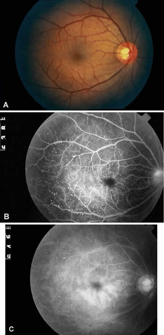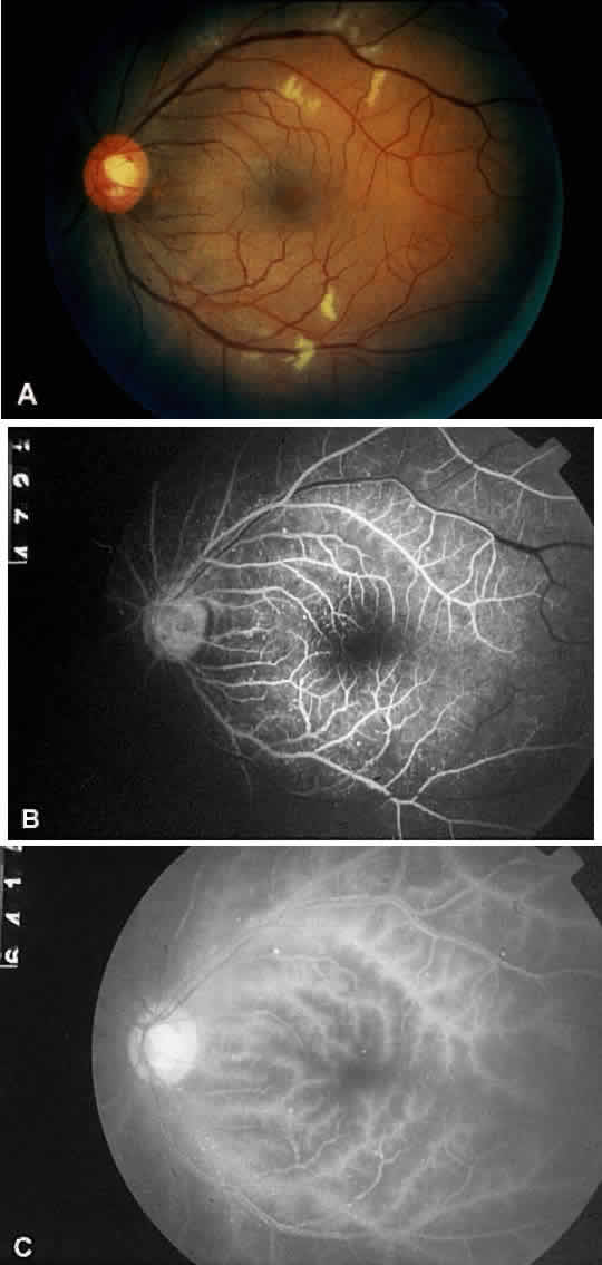 features are usually absent. CRVO and ocular ischemic syndrome both tend to affect an older patient population and display dilated and tortuous venules with dot and blot intraretinal hemorrhages.21,22 Bilateral involvement is uncommon in CRVO and occurs in a minority of cases of ocular ischemic syndrome. In contrast to ocular ischemic syndrome, CRVO may display optic disc swelling and more pronounced macular edema. On fluorescein angiography, both CRVO and ocular ischemic syndrome may display a prolonged arteriovenous transit time, but in CRVO there is no defect in the choroidal filling pattern. In ocular ischemic syndrome, vessel staining is predominantly arterial; in CRVO, it is mostly venous. On ophthalmodynamometric examination, the retinal arterial perfusion pressure is decreased in ocular ischemic syndrome but normal in CRVO. A fundus appearance similar to that found in ocular ischemic syndrome was reported to have occurred secondary to an embolus within the central retinal artery.23 Presumably, this occurred on the basis of chronic hypoperfusion. |