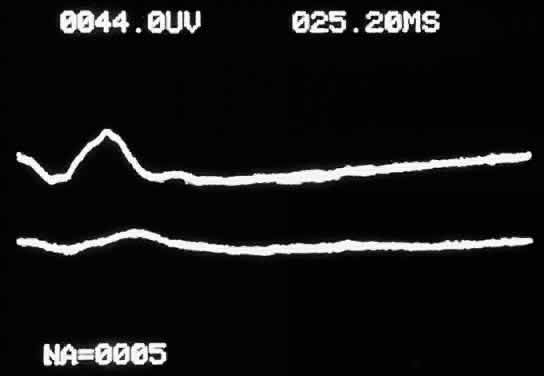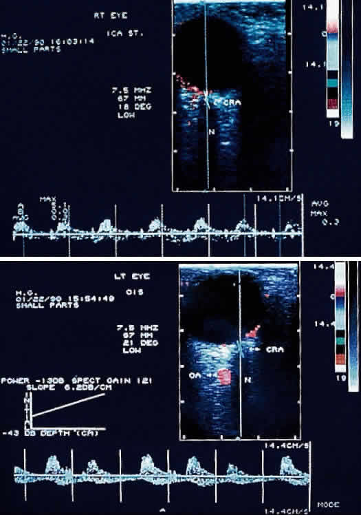 Macular edema, as evidenced by intraretinal leakage on fluorescein angiography, can be demonstrated in 15% of eyes with ocular ischemic syndrome (see Fig. 6C).26 Hypoxia and endothelial damage to the small retinal vessels, as well as microaneurysmal changes, probably account for this leakage.1,27 The ophthalmoscopic signs of macular edema are generally not as pronounced. Although small central foveal cysts have been described, they are generally not as prominent as those seen in CRVO or ocular inflammation. Late staining of the optic disc on fluorescein angiography often accompanies leakage in the macula, but disc swelling is generally absent. Microaneurysms are most commonly seen in the midperipheral and peripheral retina (see Figs. 3A and 4A). They become hyperfluorescent during the venous phase of the angiogram, and they leak as the study progresses. Rupture of these microaneurysms and leakage from small retinal vessels account for the midperipheral dot and blot intraretinal hemorrhages seen in ocular ischemic syndrome. Retinal capillary nonperfusion can be seen in some cases of ocular ischemic syndrome (Fig. 4D). These areas may contribute to the development of retinal or iris neovascularization. Histologically, these areas of capillary dropout are marked by an absence of endothelial cells and pericytes within the retinal capillaries.11,25 PHOTOPIC STRESS TEST A characteristic symptom of patients with ocular ischemic syndrome is difficulty in visual adjustment to relative darkness after exposure to bright light. This subjective symptom can be more objectively measured with the photopic stress test. After a prolonged period of normal ambient illumination, best-corrected visual acuity is measured in each eye separately. With one eye covered, the other eye is then subjected to 10 seconds of direct illumination from a bright light source, such as a direct ophthalmoscope. The amount of time required for the patient to recover his or her best-corrected visual acuity is recorded. The same procedure is performed on the other eye, and the recovery time is again recorded. A marked difference in photopic stress recovery times between the two eyes is suggestive of macular disease, such as ocular ischemic syndrome; diseases of the optic nerve would be less affected. ELECTRORETINOGRAPHY Electroretinography in eyes with ocular ischemic syndrome reveals a decreased amplitude of both the a- and b-waves (Fig. 7).1,9 The b-wave, which corresponds to the inner retinal layer, probably reflects the function of the bipolar and/or Müller cells, and it is diminished by compromised perfusion of the central retinal artery. The a-wave correlates with photoreceptor function and is affected by choroidal ischemia. Thus, the electroretinographic features of decreased a- and b-waves in ocular ischemic syndrome reflect the pathophysiology of combined retinal and choroidal hypoperfusion. ORBITAL COLOR DOPPLER IMAGING Orbital color Doppler imaging is a noninvasive ultrasound test that permits simultaneous imaging of small orbital vessels and recording of quantitative data on blood flow velocity. Unlike duplex carotid ultrasonography, which images and measures flow velocity in the large carotid vessels, orbital color Doppler imaging can image the smaller ophthalmic, central retinal, and short posterior ciliary arteries.28 With the use of orbital color Doppler imaging, the central retinal and posterior ciliary artery peak systolic velocities have been reported to be markedly reduced in ocular ischemic syndrome, as would be expected (Fig. 8).13 Reversal of ophthalmic artery blood flow, which probably represents collateral blood flow to lower resistance vascular beds, was detected in 75% of eyes with ocular ischemic syndrome. It is interesting to note that although high-grade carotid stenosis, reversal of ophthalmic artery flow, and decreased central retinal artery flow have been associated with ocular ischemic syndrome, this combination in and of itself has not been sufficient to routinely produce decreased vision. Absence of detectable posterior ciliary arterial blood flow was the only reliable indicator of poor vision. One limitation of orbital color Doppler imaging is its inability to measure volumetric blood flow directly; rather, this study modality relies on measurements of peak systolic blood flow velocity and vascular resistance, which in most physiologic situations are gauges of blood flow. Currently, orbital color Doppler imaging is most useful as an investigational technique for studying the hemodynamics of ophthalmic vascular disorders. In the future, it may provide useful information for the diagnosis and management of ocular ischemic syndrome. OPHTHALMODYNAMOMETRY AND OCULOPLETHYSMOGRAPHY In ophthalmodynamometry, the sterilized footplate of an ophthalmodynamometer is applied to the sclera after administration of topical corneal anesthesia (Fig. 9).29 The central retinal artery is observed at the slit lamp using a Hruby lens. Gentle pressure on the sclera is gradually increased by the footplate until arterial pulsations are observed. The measurement on the dial of the ophthalmodynamometer at this point is taken to be the relative retinal arterial diastolic pressure. The point at which the retinal artery collapses is taken to be the relative retinal arterial systolic pressure. In oculoplethysmography, instead of a mechanical footplate applied to the globe, a suction device is used to achieve a gradual increase in the intraocular pressure.30,31 In a fashion similar to that used for the ophthalmodynamometer, the intraocular pressure at which arterial pulsations are induced is taken to be the relative diastolic pressure of the central retinal artery, and the intraocular pressure at which the retinal artery collapses is taken to be its relative systolic pressure. The normal ophthalmic artery has a systolic pressure of approximately 100 mmHg and a diastolic pressure of approximately 60 mmHg.32 In ocular ischemic s