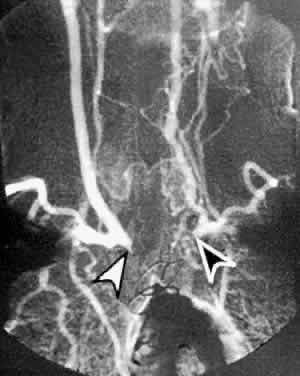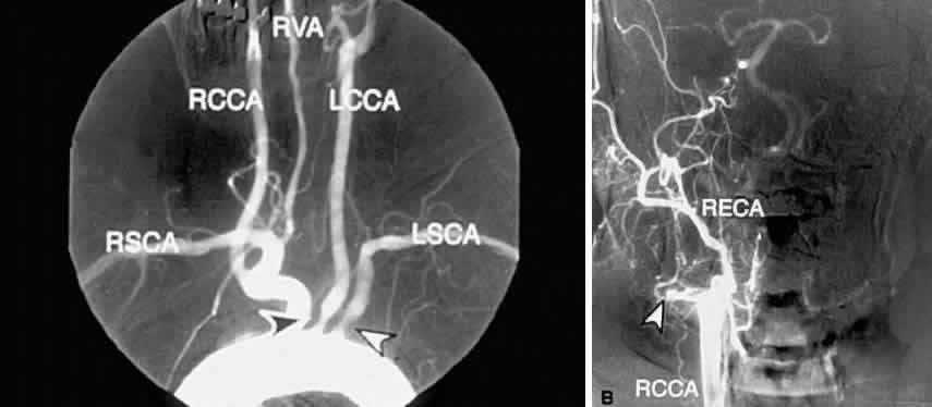 ATHEROSCLEROSIS Atherosclerotic disease, because of its occlusive effects on the carotid arteries, is by far the most common cause of ocular ischemic syndrome. Histologically, there is thickening and hardening of the carotid artery caused by lipid-rich lesions within the innermost vessel layer.49,50 These lesions may partially or completely occlude the artery, either by slow growth or by a more rapid occlusion from hemorrhage into a plaque or thrombus formation. The most common site of atherosclerosis in the neck vessels is at the origin of the internal carotid artery. From this point, the atherosclerosis often propagates downward in a retrograde fashion into the common carotid artery. Less commonly, lesions may occur at the siphon, the S-shaped portion of the internal carotid artery that lies in the cavernous sinus. Rarely, the origin of the common carotid artery is the region affected. There is an association between atherosclerosis and increased levels of plasma lipoprotein, principally low-density lipoproteins.51 Risk factors for atherosclerosis also include cigarette smoking, systemic hypertension, diabetes mellitus, advancing age, male sex, obesity, stress, and type-A personality.52 In addition to its ischemic effects on the eye via carotid occlusion, atherosclerosis is responsible for the majority of cases of cerebrovascular accident and myocardial infarction, and it is therefore the leading cause of death in developed countries. Early diagnosis of ocular ischemic syndrome can therefore reveal underlying atherosclerotic disease in the carotid arteries or other parts of the body. Conversely, evidence of atherosclerotic disease in other parts of the body should raise the possibility of occlusive atherosclerotic carotid disease as well. CEREBROVASCULAR ACCIDENT Cerebrovascular accident, the third leading cause of death in developed countries, is most commonly caused by embolism or thrombus from an atherosclerotic carotid vessel. Thus, the ophthalmologist, in recognizing ocular ischemic syndrome, can play an important role in preventing a stroke by recognizing the effects of atherosclerotic carotid disease on the eye. Conversely, a history of stroke, especially of the middle cerebral circulation, may support a suspicion of ocular ischemic syndrome.53 Internal carotid emboli most commonly affect the middle cerebral artery or its branches, and they may result in paralysis and sensory impairment of the contralateral face, arm, and leg due to damage to the somatic sensory and motor cortices. Central aphasia, word deafness, anomia, jargon speech, sensory agraphia, acalculia, alexia, right-left confusion, and hemineglect may also occur. Homonymous hemianopsia may occur because of damage to the optic radiation deep to the temporal lobe. Paralysis of conjugate gaze to the opposite side may also be seen.54 AORTIC ARCH SYNDROME Aortic arch syndrome describes the clinical picture that results when multiple branches of the aortic arch are affected by a chronic occlusive narrowing of any etiology. Compromised blood flow through the brachial artery causes arm weakness, coldness, and claudications; involvement of the carotid arteries causes symptoms of cerebral or ocular ischemia. When the ophthalmologist encounters signs of ocular ischemia accompanied by symptoms of brachial insufficiency, aortic arch syndrome should be considered as the cause. The most common causes of aortic arch syndrome are Takayasu's arteritis, giant cell arteritis, and atherosclerotic disease affecting multiple branches of the aorta. TAKAYASU'S ARTERITIS Takayasu's arteritis is a rare, chronic inflammatory disease of unknown etiology affecting the large arteries of the body, namely the aortic arch, the descending aorta, the pulmonary artery, and their primary branches. It occurs mainly in young women, and the typical age of onset is 10 to 40 years.55 It appears in all populations, but is more frequently seen in Asians. The early signs and symptoms of Takayasu's arteritis include fatigue, weight loss, low-grade fever, arthralgias, myalgias, and headaches, and it may be mistaken for juvenile rheumatoid arthritis in a young female patient. The later clinical manifestations of Takayasu's arteritis relate to the anatomic site of vascular obstruction. Decreased blood flow to the brachial arteries results in coldness of the hands, paresthesias, and asymmetric or absent brachial pulses.56 Renovascular hypertension develops in half of patients because of involvement of the renal arteries of the abdominal aorta.57 Occlusion or narrowing of the carotid or vertebral arteries may result in cerebrovascular accident.58 Ophthalmic symptoms, due to ocular hypoperfusion from occlusion of the carotid artery, are seen in 15% of cases.59 These ophthalmic changes may be identical to those of ocular ischemic syndrome caused by carotid atherosclerotic disease (see Figs. 5 and 6).60,61 Arteriography of the aortic arch region, showing smooth-walled areas of stenosis and dilation, is usually necessary to confirm the diagnosis (Fig. 11). Collateral circulation, due to the chronicity of the stenosis, is usually prominent.