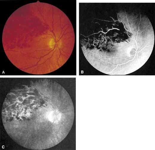 The risk of branch retinal vein occlusion decreases with increased alcohol consumption and higher levels of high-density lipoprotein cholesterol.202 There have been a few reports of hematological abnormalities in branch retinal vein occlusion.371–373 Cahill and associates have performed a meta-analysis of the published literature on total plasma homocysteine levels, serum folate and vitamin B12 levels, and homozygosity for thermolabile methylenetetrahydrofolate reductase genotype as risk factors for retinal vascular disease.390 They found that branch retinal vein occlusion was statistically associated with elevated plasma total homocysteine levels and low serum folate levels.390 For those patients with elevated plasma total homocysteine and a low serum folate, they recommend folate supplementation in conjunction with the patient's primary care physician.390 There is conflicting information in published studies on whether the refractive state of the eye is significantly associated with branch retinal vein occlusion.374–376 There are also a number of purely retinal causes of branch retinal vein occlusion, including Von Hippel's disease,203–205 Coats' disease,203 Eales' disease,203 Behçet's syndrome,206 and toxoplasmosis. CLASSIFICATION Several authors have proposed systems of classification of branch retinal vein occlusion. Some of these were proposed before the introduction of the fluorescein angiogram.6 Archer and colleagues207 were among the first to base a classification system on a number of circulatory factors determined by fluorescein angiography. Their classification showed that the spectrum of occlusion ranges from very mild and nonischemic occlusion, with good visual outcome and few complications; to severe ischemia, poor visual outcome, and major complications.207 Based on the amount of capillary nonperfusion (ischemic index) present on the fluorescein angiogram, Magargal and co-workers180 classified branch retinal vein occlusion, in a manner similar to that for central retinal vein occlusion, into three types: (1) hyperpermeable (nonischemic), (2) indeterminate, and (3) ischemic. The ischemic index is the percentage of nonperfused retina based on the amount of retina that is obstructed, rather than the entire retina. Hayreh and co-workers66 categorized branch retinal vein occlusion as mild, moderate, and marked, based on the degree of capillary nonperfusion seen angiographically. As in central retinal vein occlusion, there is a spectrum of capillary nonperfusion in branch retinal vein occlusion, ranging from little, if any, nonperfusion to extensive or almost complete nonperfusion. It is probably most clinically useful to classify eyes as nonischemic and ischemic because neovascularization generally occurs only in the ischemic cases. Some eyes will be difficult to categorize definitively at the time of initial presentation because of the amount of retinal hemorrhage present. In addition, some eyes will develop increased ischemia similar to the situation in central retinal vein occlusion. CLINICAL CHARACTERISTICS There is usually little difficulty in diagnosing acute branch retinal vein occlusion. The key to the diagnosis lies in the unilateral and segmental distribution of the ophthalmoscopic findings. This distribution of findings distinguishes branch retinal vein occlusion from other disorders involving hemorrhage, cotton-wool spots, and retinal edema. The difference between involved and uninvolved retina is usually quite striking. If the vein occlusion is of insidious onset, the ophthalmoscopic findings may be more subtle, but still occur only in the distribution of the affected branch retinal vein. The patient is usually aware of a painless decrease in visual acuity that can occur suddenly or over a period of several days to several months. Patients often describe this as misty or distorted vision. The visual decrease is acute in 75% of patients.207 Visual acuity in branch retinal vein occlusion is not as severely affected, as it is in central retinal vein occlusion. Forty-one percent of eyes will have an initial visual acuity of 20/20 to 20/50, 25% will have 20/60 to 20/200, and 32% will have 20/200 or worse.180 However, if the macula is not involved, there may be no visual symptoms unless the patient notices a visual field defect. The right and left eyes are equally involved, and bilateral branch retinal vein occlusion can be found in approximately 3% to 9% of patients94,181 Field defects range from relative to absolute scotomata and peripheral depression in the involved corresponding segment.208 The clinical picture of branch retinal vein occlusion is retinal hemorrhages that are segmental or pie shaped in distribution (see Fig. 8; Fig. 9). The apex of the obstructed tributary vein almost always lies at an arteriovenous crossing. Usually some degree of pathologic arteriovenous nicking is present.188 The occlusion is commonly located one or two disc diameters away from the optic disc. However, the occlusion may lie at a point near the disc edge or, less frequently, may involve one of the smaller, more peripheral tertiary or macular branches. The veins in the occluded segment are distended, tortuous, and dark. That portion of the main trunk proximal to the blockage is narrower than the distal segment. Smaller venules are visibly engorged. Flame hemorrhages are the predominant ophthalmoscopic finding, although dot hemorrhages may be seen in the macular area or in the more peripheral retina. In some patients, these hemorrhages may be so dense that they obscure the underlying retinal anatomy. Occasionally, blood lodges between the internal limiting membrane and the hyaloid membrane and forms a boat-shaped preretinal hemorrhage. Occasionally the hemorrhage breaks through the hyaloid face into the vitreous, accounting for the “floaters” patients report. Ophthalmoscopically, these findings are worse in ischemic occlusions than in nonischemic occlusions. Cotton-wool pa