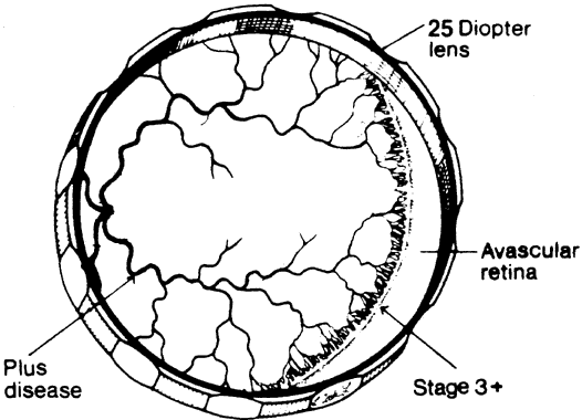 Initially, acceptance of this form of therapy was slow, but it later gained acceptance in the United States.32,53, 54, 55, 56, 57, 58 To resolve any doubt concerning the value of cryotherapy for ROP, the National Eye Institute supported a multicenter prospective randomized clinical investigation called the Multicenter Trial of Cryotherapy for Retinopathy of Prematurity (abbreviated as CRYO-ROP Study). The preliminary results were so favorable that a special expedited publication was released in 1988.59,60 In the CRYO-ROP Study, eligible patients were those who weighed less than 1251 g at birth. Examinations commenced at 4 to 6 weeks of age and were repeated every 2 weeks unless the ROP reached a prethreshold stage: zone I, any stage; zone II, stage 2 (ridge) with plus disease; or zone II, stage 3 (ridge with extraretinal fibrovascular proliferation) less than threshold. Examinations then were repeated at least weekly until progression to threshold disease. Threshold disease was defined as at least five contiguous or eight cumulative 30-degree sectors (clock hours) of stage 3 ROP in zones I or II in the presence of plus disease (Fig. 7). The risk of blindness at threshold was predicted to be 50%. Once threshold disease was reached, the affected eye was randomly assigned to either treatment or observation. If cryotherapy was assigned, then treatment was performed within 72 hours to minimize the risk of progression to stage 4 ROP before treatment could be performed. In the CRYO-ROP Study, the choice of anesthesia was left to the treating physician. When performing cryotherapy, we almost exclusively treated our patients under local anesthesia with infiltration of the subconjunctival space with 0.5% or 1% lidocaine. For cryotherapy, conjunctival incisions rarely are necessary, especially if anterior therapy is performed first, since this softens the globe, allowing for the cryoprobe to be placed further posteriorly. For those still using cryotherapy, the standard retinal cryoprobe was used most often in the study, but a cataract probe and the newer neonatal probes are equally effective. Contiguous single spots of cryotherapy should be applied to the avascular retina anterior to the ridge, but the ridge itself should not be treated because of the possibility of inducing a hemorrhage. The endpoint for the freeze should be sudden whitening of the retina, and the avascular retina should be treated for 360 degrees. The number of applications range from 35 to 50. We now use laser with topical anesthesia in the ICN with monitoring by a neonatologist. Seven days after treatment, the treated eye should be re-examined to assess the effects of treatment. Retreatment is indicated if there are untreated (skip) areas and persistent plus disease in association with either of the following characteristics: segmental shallow retinal detachment (suggesting continued adjacent disease activity) in the areas skipped, or progression of extraretinal fibrovascular proliferation (increasing floridity of the ridge) contiguous with a skipped area. When retreatment is performed, it should be applied only to previously untreated areas in sectors of continued activity. This rarely has been necessary since switching to laser treatment. Preliminary results of the CRYO-ROP Study were based on a 3-month follow-up of eligible infants within the study. The mean birth weight of randomly assigned patients was 800 g, the mean gestational age was 26 weeks, and the mean chronologic age at randomization was 11 weeks. An unfavorable outcome was defined as (1) a retinal fold involving the macula, (2) a retinal detachment involving zone I of the posterior pole, or (3) retrolental tissue or “mass.” There was a 49.3% statistically significant overall reduction in the unfavorable outcome rate at 3 months in the treated versus the untreated eyes (21.8% compared with 43.0%).60 Subsequent reports of the Cryo-ROP Study show persistence of a favorable outcome with treatment. At 1 year, there was a 45.8% reduction in the unfavorable structural outcome rate in eyes of patients randomly assigned to treatment compared with control eyes.61 There was a continued positive effect on structural outcome as a result of treatment as infants were followed at 3½ and 5½ years after randomization.62,63 As children became older and visual acuities could be obtained, there was a similar overall beneficial effect on vision in the treated compared with the control eyes.62,63 However, there were fewer treated eyes than control eyes in the best visual outcome group (20/40 or better) at 5½ years, suggesting a possible adverse effect of cryotherapy on visual acuity or the fact that the untreated eyes never reached as advanced a stage as the treated eyes.63 Ocular complications recorded within the CRYO-ROP Study were not serious, but a 9% incidence of bradycardia or arrhythmia within the study underscores the need for both careful monitoring and performance of the treatment in a facility where resuscitation can be achieved immediately. Greven and Tasman64 report on the occurrence of rhegmatogenous retinal detachment after cryotherapy for ROP that was administered in the manner described in the CRYO-ROP Study. Detachment occurred 1 to 4 years after treatment. Three infants developed rhegmatogenous retinal detachments with breaks located at the posterior edge of cryotherapy. Two of the retinas were reattached with a scleral buckling procedure, but useful vision was regained only in one eye. In the third eye, progression to total inoperable retinal detachment occurred despite scleral buckling. Quinn and associates64a have shown that visual field loss is less than 10% when older children who had cryotherapy are tested. The recommendation of the CRYO-ROP Study was that at least one eye of symmetrical cases at threshold should receive cryotherapy. Surgeons should use their own clinical judgment beyond that recommendation. Our personal recommendation is to treat all ey
