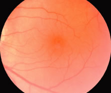 Soon after, spontaneous vitreofoveal separation may occur. The contracted prefoveolar vitreous cortex (now detached from the underlying retina) may become visible as a semitranslucent prehole opacity (pseudo-operculum) lying anterior to a small foveolar hole. This condition is classified as a stage 2 full-thickness macular hole (Fig. 5). Centrifugal retraction of foveolar retinal receptors continues to enlarge the diameter of the hole; Gass suggested that any hole 400 μm or larger should be classified as a stage 3 macular hole (Fig. 6). After separation of the vitreous from the entire macula and optic disc, the hole is classified as stage 4, regardless of its diameter. Recently, the introduction of optical coherence tomography (OCT) has allowed researchers to study the exact relationship between the vitreous and fovea in the development of macular holes. OCT is analogous to ultrasound but measures optical, rather than acoustic, reflectivity (Fig. 7). The higher frequency of light waves compared with acoustic waves allows for a much higher longitudinal resolution (10 μm vs. 150 μm). OCT evidence suggests that in most macular holes, the first step is actually the formation of a foveal pseudocyst (splitting of the retina at the fovea). It is postulated that anterior tractional forces from the prefoveal vitreous cortex cause this pseudocyst to form. The anterior wall of this cyst serves as a flap in stage 2 holes and as an operculum in stage 3 holes.15,16 |