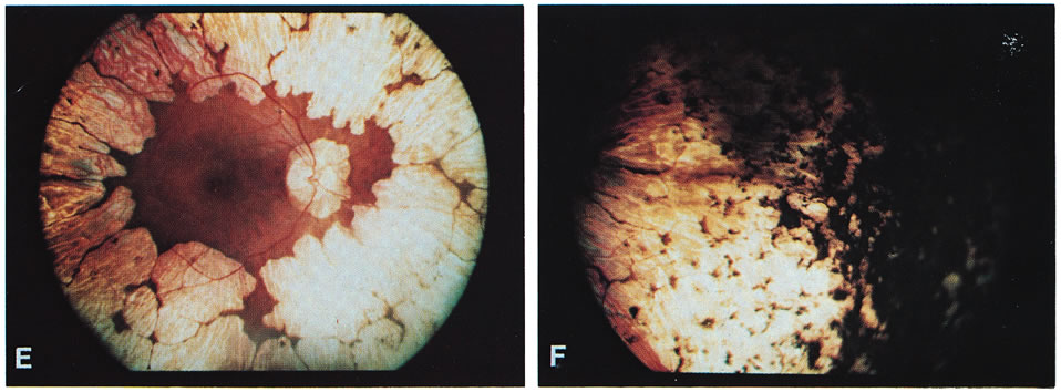 Other: Francois48 reported an association of Alder's anomaly (the presence of numerous azurophilic granules in the cytoplasm of neutrophils, which stain dark violet by Pappenheim's technique) with GA in one patient. However, Alder's anomaly has generally been associated with Hurler syndrome and has not been reported in association with GA by other investigators. In a study performed at the U.S. National Eye Institute, and therefore not expected to deal with a homogenous genetic population (as one might find with Finnish GA patients), an increased occurrence of thyroid disease in patients with GA compared with control patients was found by Whitcup and colleagues.49 Seven of 34 patients with GA had thyroid disease, resulting in an estimated odds ratio for thyroid disease in GA patients of 12.7 that of normal controls. Similar but less pronounced results were found in retinitis pigmentosa patients, with an estimated odds ratio of 6.2 compared with normal controls. ANIMAL DATA Hepatic mitochondrial changes similar to those seen in patients with GA have been produced in normal rats maintained on high-ornithine diets.50 A case of an adult male cat with retinal degeneration, extreme hyperornithinemia, and absence of OAT—an apparent replica of human GA—was reported by Valle and associates.51 Attempts to breed the cat were unsuccessful, and it later died. Histopathologic examination of the cat's eyes demonstrated extensive neuroretinal and RPE damage and cell loss. There was a decrease in the number of small choroidal vessels, but not the large ones. In cats with other retinal degenerations, such loss of RPE and choriocapillaris is uncommon. This “GA cat” did not have cataracts. Kuwabara and associates52 demonstrated selective destruction of RPE cells in rats and monkeys after intravitreal injections of ornithine. Secondary destruction of overlying photoreceptors and underlying choroid developed later. Based on these data, they suggested that the RPE may be the primary target organ in GA. A more recent attempt by Daune-Anglard and colleagues53 to mimic the damage of GA with induced ornithine toxicity in mice and chickens using 5-fluoromethylornithine (5FMOrn) administered orally for 53 days showed no ocular pathologic changes in these animals despite a tenfold increase in tissue ornithine. However, 10% to 20% of tissue OAT is refractory to inactivation by 5FMOrn, so these results only show that mice and chickens will not develop GA as a result of sustained hyperornithinemia due to incomplete blockage of OAT for this period of time. Subsequently, Wang and colleagues54 successfully created a mouse model of GA that closely mimics GA in human patients. Using targeted disruption of the murine OAT gene, they produced OAT-deficient mice that exhibit chronic hyperornithinemia, ten to 15 times normal. These OAT-deficient mice developed slowly progressive retinal degeneration over the first 12 months of life. The RPE cells were the initial site of damage. Using this mouse model of GA, Wang and colleagues55 further evaluated the effect of long-term reduction in ornithine on prevention of retinal degeneration. OAT-deficient mice fed an arginine-restricted diet for 12 months had significantly reduced plasma ornithine levels. Importantly, retinal degeneration, as measured by ERG and retinal histologic and ultrastructural studies, was prevented. The researchers concluded that ornithine accumulation, and not OAT activity in the retina and RPE, is a necessary factor in the pathophysiology of retinal degeneration in GA. DIFFERENTIAL DIAGNOSIS Ocular Although cases of GA have been mislabeled as many other things, usually “atypical retinitis pigmentosa,” and patients referred as having GA often turn out to be suffering from some other disorder, the diagnosis is actually quite easy to make if the five main features (see previous Diagnosis section) can be recalled (Fig. 5). Confusion in diagnosis is primarily due to the rarity of the disease. It is extremely unlikely that any primary care ophthalmologist would have the opportunity to make this diagnosis more than once in a career, since the incidence of GA appears to be less than one in 1,000,000 everywhere except in Finland, where it occurs in about one in 50,000 individuals.8