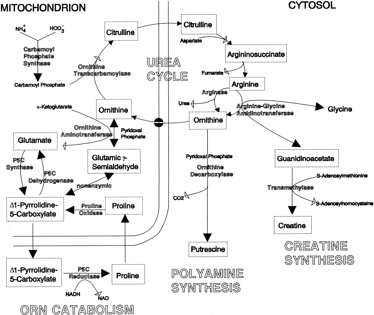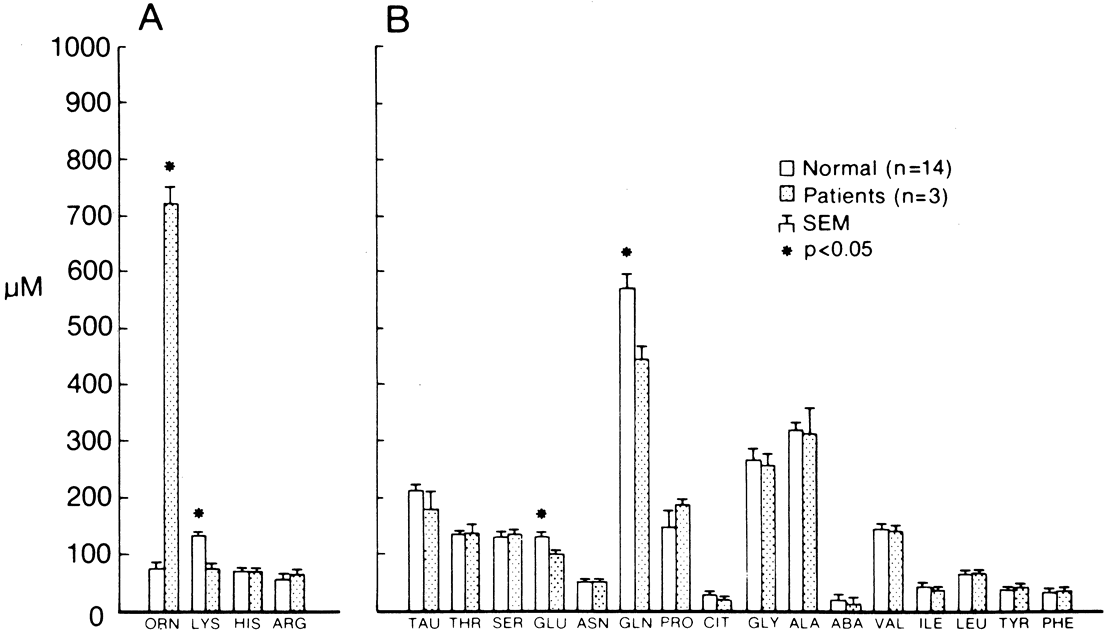 ALTERED PLASMA AMINO ACID PROFILE Ornithine is a dibasic amino acid that is not normally found in proteins (Figs. 6 and 7). However, it plays a pivotal role in the urea cycle (Fig. 8). The initial discovery by Simell and Takki9 of extreme elevations of ornithine levels in the plasma, urine, cerebrospinal fluid, and aqueous humor of patients with GA encouraged others to search for secondary alterations in amino acids. McCulloch and coworkers11 and Arshinoff and coworkers46 reported the presence of hypolysinemia, hypoglutamic acidemia, and hypoglutaminemia, which was confirmed by Valle and coworkers,88 who also found the presence of hypoammonemia. The mechanism of the hypolysinemia, hypoglutamic acidemia, hypoglutaminemia, and hypoammonemia has been proposed to be excessive excretion secondary to renal tubular readsorption competitive blockade by hyperornithinuria in the renal proximal tubular filtrate.46,88,89