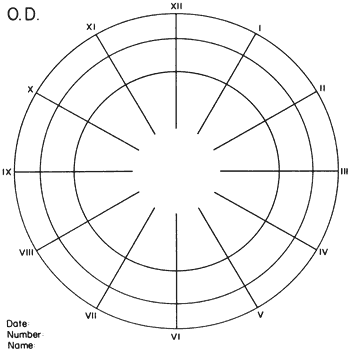 physician's observations are recorded on an ocular fundus chart (Fig. 1) using a standardized color code (Table 1).
