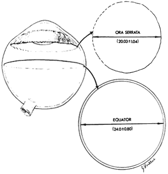 the posteriorborder of the limbus, the distance is 6.14 ± 0.85 mmsuperiorly, 6.20 ± 0.76 mm inferiorly, 5.73 ± 0.81 mmnasally, and 6.53 ± 0.75 mm temporally (Fig. 2).1,2 The retina expands from the optic disc to line the posterior pole and reach the equator, where it has an average diameter of 24.08 ± 0.94 mm in the vertical meridian and 24.03 ± 1.04 mm in the horizontal meridian. From the equator to the ora serrata, the retina diminishes in size so that at theora serrata the average retinal diameter is 20.41 ±1.09 mm vertically and 20.03 ± 1.04 mm horizontally (Fig. 3). Thus, the retina has the shape of a cup that is expanded to its greatest diameter at the equator and is considerably reduced in diameter at its serrated anterior margin.