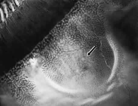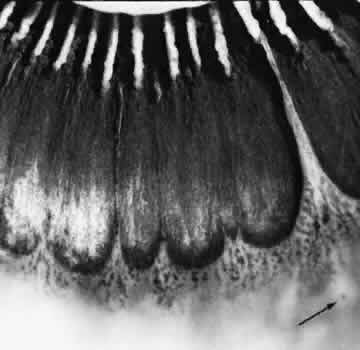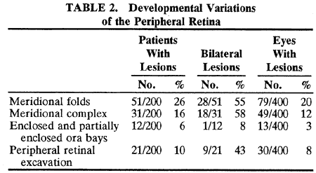 MERIDIONAL COMPLEX A meridional complex is the occurrence of a dentate process and a ciliary process within the same meridian. When this abnormal alignment occurs, the den-tate process is exceptionally large, usually combined with a meridional fold, usually continuous with an enlarged ciliary process, and often associated with peripheral retinal excavation in the corresponding meridian (Fig. 9). The large dentate process and meridional fold are composed of excessive, disorganized, somewhat degenerated retinal tissue (Fig. 10). Meridional complexes are present in 16% of the population, are bilateral in 58% of affected patients, and thus are present in 12% of all eyes (see Table 2). The complexes are multiple in 45% of the affected eyes; they are most common in the superior nasal quadrant. ENCLOSED ORA BAY Enclosed and partially enclosed ora bays are relatively uncommon developmental variations. These are oval islands of pars plana epithelium located immediately posterior to the ora serrata and com-pletely or almost completely circumscribed by the peripheral retina (Figs. 11 and 12). The enclosed ora bay is composed of a thin layer of nonpigmented pars plana epithelium surrounded by neurosensory retina. Enclosed and partially enclosed ora bays are evident in 6% of patients, are bilateral in 8% of affected individuals, and are present in 3% of all eyes (see Table 2). These lesions are equally prevalent nasally and temporally near the horizontal meridian.6,7 PERIPHERAL RETINAL EXCAVATION Peripheral retinal excavation appears as a rather small oval depression in the retina. Usually this lesion is aligned meridionally with a meridional fold or complex and located 1 to 7.2 mm posterior to the ora serrata (Fig. 13; see Figs. 6 and 12). The focal depression may be surrounded by margins that appear to be elevated; however, microscopic examination reveals that the depression corresponds to afocal loss of the inner retinal layers and that the surrounding tissue is normal (Fig. 14). Peripheral retinal excavation is present in 10% of patients, is bilateral in 43%, and therefore is evident in 8% of all eyes (see Table 2). Half of the affected eyes contain two or more areas of focal excavation, and most of the excavations are located in the superior nasal quadrant. Developmental variations of the peripheral retina are present in about 20% of eyes. These conditions have certain common features: they are present at birth, persist throughout life, tend to occur symmetrically in anatomically corresponding positions in both eyes, and are commonly associated with an abnormal alignment of a dentate and a ciliary process in the same meridian.5 Clinically, these developmental abnormalities are readily identified in the peripheral retina. The ridgelike elevation of a meridional fold is best seen by scleral depression combined with indirect ophthalmoscopy. A meridional complex should be suspected (even though the ciliary processes are not visible) when a large dentate process, a meridional fold, and peripheral retinal excavation occur in the same meridian. An enclosed ora bay appears as a depressed, bright red area that simulates a retinal hole. Although identification of an enclosed ora bay is aided by a thin epithelial layer extending across the base and by the absence of any elevation of the surrounding retina, in some instances, distinction between an enclosed bay and a retinal hole is impossible. Peripheral retinal excavation presents as a small retinal pit that may be adjacent to or up to 4 disc diameters posterior to the ora serrata. This form of focal depression probably has been often mistaken for a full-thickness retinal break; therefore, knowledge of developmental variations is essential to the appropriate diagnosis of a peripheral retinal lesion. In clinical studies, retinal breaks posterior to meridional folds have been noted in a number of eyes with rhegmatogenous retinal detachment.8 Retinal tears may also develop at or near the posterior margins of enclosed ora bays.7 Therefore, when retinal detachment is present, the ophthalmologist must carefully search for meridional folds, meridionalcomplexes, enclosed ora bays, peripheral retinal excavations, and any associated retinal breaks. TROPHIC PERIPHERAL RETINAL DEGENERATIONS Various specific peripheral retinal degenerations augment these developmental variations. Degeneration (i.e., irreversible retrograde change) is evident in the peripheral retina of every adult. For classification, this degeneration may be regarded as trophic when the primary process is a loss of retinal tissue, tractional when the process is related primarily to tugging or pulling of vitreous or zonule on the retina, and trophic and tractional when both retinal tissue loss and vitreous-zonule traction are involved. The principal peripheral retinal degenerations are noted in Table 3.