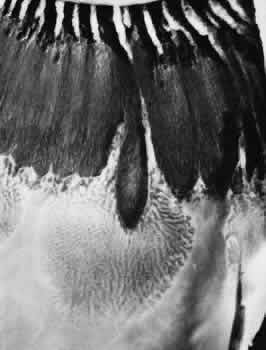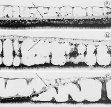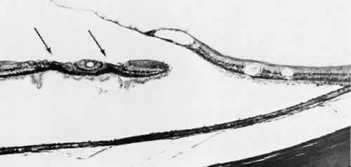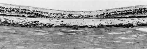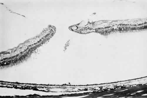 Cystic retinal tufts are present at birth; they are evident in 5% of adults, are bilateral in 6% of affected patients, and thus are detected in 2.5% of adult eyes (see Table 3). Although cystic retinal tufts show no quadrant predilection, 78% occur in the equatorial (extrabasal) zone, and 80% occur singly in eyes of affected patients. On clinical examination, cystic retinal tufts are readily visualized and are distinguishable from noncystic tufts by size and other characteristics. Cystic retinal tufts are of importance because they may be avulsed by vitreous traction, with or without posterior vitreous detachment leading to retinal tear or retinal detachment. Of patients with retinal detachment, an avulsed cystic retinal tuft is implicated in up to 7% of eyes. However, of all patients with a cystic retinal tuft, only 0.18% would develop retinal detachment due to this lesion. As such, prophylactic laser photo-coagulation for cystic retinal tuft is not recommended.35 ZONULAR-TRACTION RETINAL TUFT The zonular-traction retinal tuft always projects from the retinal surface internally and anteriorly toward the zonule (Fig. 40). Usually single and located within the vitreous base, zonular-traction retinal tufts are joined to zonular fibers at the apex; the tufts, which vary in length and thickness, are associated with a broad range of trophic and tractional alterations at the retinal end of the process. Histopathologic changes include zonular attachments at the apex, neuroglial cells within the tuft, and degeneration with retinal thinning at the base (Fig. 41). Retinal holes and tears result from the combination of trophic changes at the base and traction resulting from zonular fibers. Within the vitreous base and posterior to it, zonular-traction tufts may be associated with partial-thickness or full-thickness retinal tears that can occur in the absence of posterior vitreous detachment. Zonular-traction tufts are present at birth and detected with equal frequency in patients of all ages; they are noted in 15% of patients, are bilateral in 15% of affected people, and thus are evident in 9% of all eyes (see Table 3). These tufts are most common in the nasal quadrants, usually attached to the retina less than 0.5 mm posterior to the ora serrata and only infrequently attached to the retina posterior to the vitreous base.27,36 Clinical examination of the peripheral fundus reveals zonular-traction tufts in patients of all ages. These lesions are distinguished from noncystic and cystic retinal tufts by their greater size, sharp anterior angulation, and close proximity to the ora serrata. Zonular-traction tufts are a significant cause of small, round retinal holes in the extreme periphery of the retina. Although retinal holes within the vitreous base are considerably less likely to produce retinal detachment than holes posterior to the vitreous base, surgical aphakia or pseudophakia, which necessarily involves some form of zonular traction, is associated with an increase in the frequency of retinal detachment, which is likely to be related to small retinal breaks in the nasal periphery.36,37 PARTIAL-THICKNESS RETINAL TEAR A partial-thickness retinal tear involves the inner layers of the retina and results in a thin flap or free operculum.38 Partial-thickness retinal tears are usually multiple and are classified into two types by distribution: paravascular tears occurring adjacent to peripheral retinal vessels and vitreous base tears aligned circumferentially along a segment of the posterior border of the vitreous base. Both forms, which sometimes exist concurrently in the same eye, reflect anatomic features and mechanisms that are of practical importance in ophthalmology. Paravascular partial-thickness retinal tears stem from exaggerated vitreoretinal attachments at and immediately adjacent to peripheral arterioles and venules. These relatively firm attachments often produce multiple, discrete foci of cystic degeneration adjacent to peripheral retinal vessels. When posterior vitreous detachment occurs, the inner retinal layers at these foci of paravascular rarefaction remain attached to the vitreous, and clusters of partial-thickness retinal tears are formed. After this avulsion, microscopic studies of the retina show focal absence of the internal limiting membrane and absence of varying amounts of the inner retinal layers.39 Paravascular partial-thickness retinal tears occur in 17% of adults, are bilateral in 27% of affected patients, and thus are present in 11% of adult eyes (see Table 3). Posterior vitreous detachment is present in 100% of affected eyes. The superior quadrant is the area most commonly involved, and the tears are always located posterior to the vitreous base. On clinical examination by contact lens biomicroscopy, paravasealar retinal rarefaction is seen as a subtle irregularity of the retina adjacent to the peripheral retinal vessels. Paravascular partial-thickness retinal tears are visible as small, usually multiple retinal craters adjacent to peripheral retinal vessels. These tears assume substantial clinical significance because of the occasional association with retinal vessel avulsion and the frequent association with partial-thickness vitreous base tears and full-thickness peripheral retinal tears. Partial-thickness retinal tears also develop in association with posterior vitreous detachment as multiple flap tears aligned circumferentially along a segment of the posterior border of the vitreous base. Inner retinal layers are partially avulsed and attached to the detached vitreous body.27 Partial-thickness retinal tears at the posterior border of the vitreous base are present in 12% of adults, are bilateral in 5% of affected patients, and thus are noted in 7% of adult eyes (see Table 3). The process is equally prevalent in all quadrants, is always located at the posterior margin of the vitreous base, and is invariably associated with posterior vitreous detachment. On clinical e