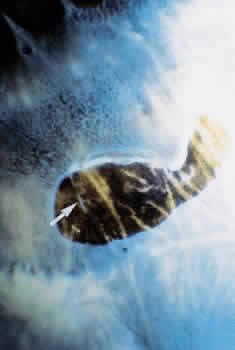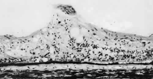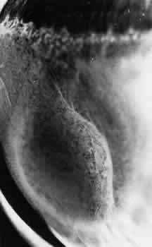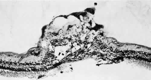 On clinical examination, these tufts are commonly observed as small, pointed retinal projections within the area of the vitreous base. In later life, degenerative changes within the tufts may cause the tips of the tufts to break off, producing small spherical fragments that float in the vitreous adjacent to the base. These tufts are not associated with full-thickness retinal breaks and can be considered to be innocuous. CYSTIC RETINAL TUFT Larger than a noncystic tuft, the cystic retinal tuft is a nodular projection of retinal tissue that extends from a vitreous attachment at the apex to a base that is more than 0.1 mm in diameter and surrounded by cystic retinal degeneration (Fig. 38). Single ormultiple cystic retinal tufts may be located within or posterior to the vitreous base. On microscopic appraisal, the tuft, attached internally to a vitreous strand, is composed of degenerated and proliferated retinal cells that may contain a few pigment granules (Fig. 39). There may also be degeneration of the adjacent retinal pigment epithelium.