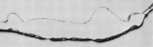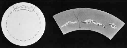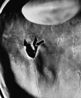 Related to vitreous traction as well as to the overall stage, area, and anteroposterior location of the lattice degeneration is the tendency for tears to form along the posterior margin or end of the lesion where vitreous separation from the retina occurs. The tear, almost always associated with posterior vitreous detachment, assumes a linear form if it extends along the posterior margin, an L shape if there is anterior extension at one end, and a U shape if there is anterior extension at both ends (Fig. 33). Tears may be single or multiple and small or very large and may occur with or without associated rhegmatogenous retinal detachment.