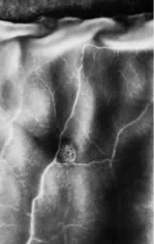Early stages of lattice degeneration have the characteristic spindle shape and circumferential orientation, but in general they are relatively narrow with a troughlike central retinal thinning; variable, round, punched-out areas of extreme retinal thinning; typical vitreous alterations; retinal blood vessels that appear normal; and mild pigment alterations (Fig. 31). Advanced stages of lattice degeneration may retain the characteristic shape and orientation but tend to be somewhat wider with a greater degree of overall retinal thinning, of arborizing white lines that are often continuous with blood vessels, and of conspicuous retinal pigment alterations. In addition, round or oval areas of extreme retinal thinning or holes are more common, liquefaction in the overlying vitreous is greater, and vitreoretinal attachments at the margin of the process are more pronounced.