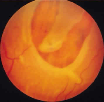 Full-thickness retinal tears unassociated with lattice degeneration, cystic retinal tuft, zonular-traction tuft, or other identifiable retinal abnor-mality are likely to occur at sites of exaggeratedparavascular vitreoretinal attachment and along the posterior border of the vitreous base. When posterior vitreous detachment occurs, full-thickness as well as partial-thickness tears may occur at one or more of these locations. On histologic examination, full-thickness retinal tears demonstrate vitreous attachment to the degenerated retinal flap or free operculum, gliosis and degeneration adjacent to the smooth, rounded margins of the tear, a variable degree of associated retinal detachment, and a combination of cell breakdown and hyperplasia in the underlying retinal pigment epithelium.27 Retinal breaks occur in about 13% to 14% of autopsy cases.40 Excluding retinal tears at the ora serrata and tears related to lattice degeneration or other identifiable disease processes, full-thickness retinal tears are found in 12% of adults at autopsy, are bilateral in 5% of affected adults, and are present in 7% of adult eyes (see Table 3). These lesions are most prevalent in the inferior temporal quadrant, are always located posterior to the vitreous base, and are universally associated with posterior vitreous detachment. Approximately half such full-thickness retinal tears are associated with at least a localized retinal detachment; this is especially likely to be present where the tear is located in the superior temporal or superior nasal quadrant. Clinical identification of full-thickness retinal tears is particularly significant. In the presence of posterior vitreous detachment, attention may be focused on abnormal retinal areas by a free operculum, projecting retinal flap, hemorrhage, or localized retinal pigment epithelium alteration.41 With or without these diagnostic clues, full-thickness retinal tears are visible on contact-lens biomicroscopy or on indirect ophthalmoscopy and scleral depression. As the scleral depressor creates translucency in the adjacent sensory retina, the tear is seen as a contrasting red area. A retinal tear and a retinal hemorrhage may be differentiated by the fact that the intensity of the contrasting red color of a tear varies with the position of the scleral depressor, but the red color of a retinal hemorrhage is unaffected by movement of the depressor. Full-thickness retinal tears should be carefully evaluated because these tears often warrant prophylactic therapy in an effort to prevent retinal detachment, and they require treatment when associated with rhegmatogenous retinal detachment. GENERALIZED RETINAL DISEASES Superimposed on normal morphology, developmental variations, and common degenerative processes of the peripheral retina is a wide array of diseases capable of affecting all parts of the retina. Among these diseases are developmental malformations (e.g., coloboma of the retina and choroid and familial hyaloidal vitreoretinopathies); vascular disorders (e.g., vasculitis and sickle cell diseases); metabolic diseases (e.g., diabetic retinopathy); infectious diseases (e.g., toxoplasma retinochoroiditis); neoplasms (e.g., retinoblastoma); degenerative disorders (e.g., retinitis pigmentosa); and traumatic disorders (e.g., traumatic retinitis and traumatic retinal dialysis). Pathologic features and clinical manifestations of these diseases are influenced by the specific anatomy of and relationships in the peripheral retina, the developmental variations, and the spectrum of degenerative changes that occur in the peripheral retina. |