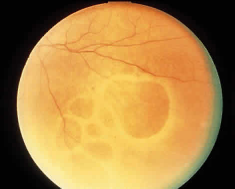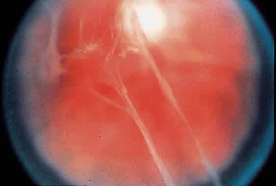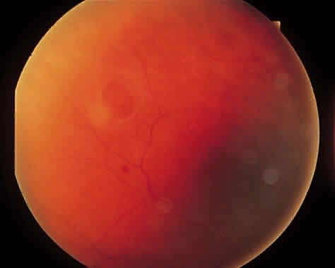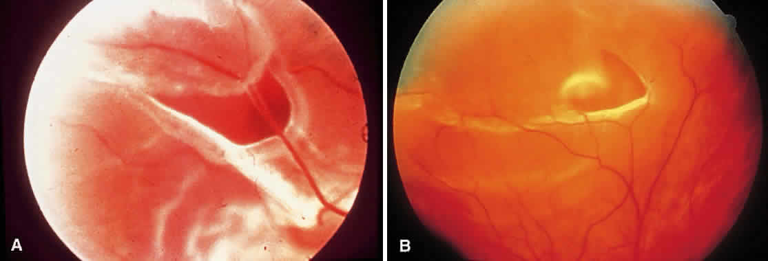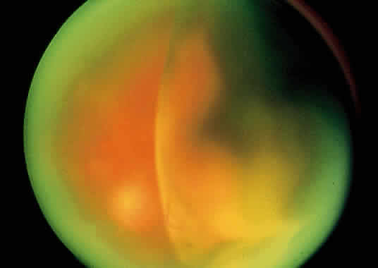 EARLY A recently detached retina loses its transparency and assumes a gray, translucent appearance. Eye movements typically cause the detached retina to undulate in a characteristic manner. Fine, irregular corrugations are usually present and are the result of intraretinal edema.87,88 The fine details of the choroidal vasculature are somewhat obscured by the overlying detached retina (Fig. 9). Within days of an RRD, outer retinal degeneration starts to occur.89,90 The magnitude of the photoreceptor damage that occurs is related to the height and the duration of the RRD.88 At this early stage, the circulation of the inner retina is not affected; thus, the inner retina remains well preserved. If the retina is reattached within a week, most of the cellular changes are reversible.91 RPE cells underlying the RRD can be released into the subretinal fluid and may pass through the retinal break into the vitreous cavity. These cells may be appreciated in the anterior vitreous, where they are known as tobacco dust.87,88,92