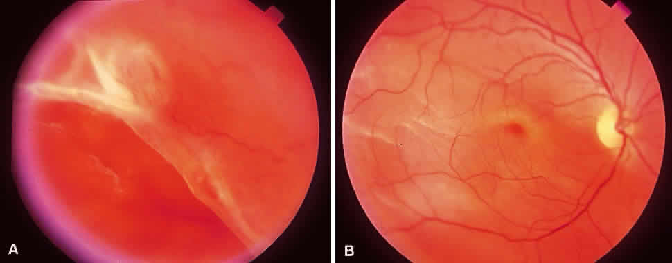LATTICE DEGENERATION Lattice degeneration of the retina is characterized by focal thinning of the inner retinal layers associated with liquefaction of the overlying vitreous and strong vitreous attachments to the margins (Fig. 5). Hyalinized blood vessels in areas of lattice often take on the characteristic lattice appearance for which this condition is named. Areas of lattice are frequently elliptical and oriented parallel to the ora. These patches are often multiple, and they occur most often in the superior and the inferior retinal periphery.47 Some variants of lattice are oriented perpendicular to the ora, often straddling the peripheral retinal vessels—a configuration referred to as radial or meridional lattice. One third of all RRDs are associated with lattice, although lattice is estimated to occur in only 6% to 10% of the general population.4,23,48–51 This condition is bilateral in one third of those affected, and it is more prevalent in myopic versus hyperopic eyes.4,23,48–51 Two forms of retinal breaks are associated with lattice: atrophic holes in the lattice, and flap tears at the posterior border or at the ends of the patch. Atrophic holes occur in about one third of the patients with lattice and are frequently present in young patients. RRD is a rare complication of atrophic holes in lattice; when it occurs, it tends to progress slowly.4,51,52 Due to their relatively benign nature, treatment is rarely warranted for these atrophic holes. Horseshoe tears associated with lattice, in contrast, have a more ominous prognosis. The retinal flap is generally adherent to the detached cortical vitreous face, and this holds the tear open. These flap tears, especially when they are symptomatic, can cause rapidly progressive RRD.9,36,42,51,53 MYOPIA Although present in only 10% or less of the general population, significant myopia is associated with 42% of all RRDs.23,50 This higher incidence of RRD among myopic eyes has been attributed to a variety of causes. The incidence of PVD is higher for any given age group in people with myopia compared with those with emmetropia and hyperopia.14,54 Further, the incidence of lattice degeneration is increased in myopes.4 Finally, the peripheral retina is more vulnerable to developing retinal tears in myopic eyes.28 When symptomatic retinal tears are present in patients with moderate to high myopia, prophylactic treatment should be undertaken. CATARACT EXTRACTION Cataract extraction is an independent risk factor for RRD. The incidence of RRD after intracapsular cataract extraction is greater than after extracapsular cataract surgery. After uncomplicated surgery, the risk of RRD is estimated to be 2% to 5% with intracapsular surgery and approximately 1% with extracapsular. In contrast, the incidence of RRD is 0.01% to 0.05% in the general phakic population.8,55–58 Vitreous loss during cataract surgery increases the risk of RRD 4.5-fold to approximately 5%.56,59 Likewise, YAG capsulotomy increases the risk of RRD 3.9-fold.60–62 Other risk factors that increase the risk of RRD with cataract extraction include myopia, young age, white race, prior RRD surgery, and RRD in the fellow eye.18,56,57,63,64 The causative retinal break is most frequently located superotemporally in phakic, pseudophakic, and aphakic RRDs. Nonetheless, both superonasal breaks and breaks that go undetected at the time of intervention are more common after cataract extraction.65–68 The tendency for breaks to be smaller and more anterior, combined with the postsurgical changes in the anterior segment, combine to make tears difficult to localize. Overall, the rate of missed breaks after cataract surgery ranges from 5% to 16% versus 2% to 5% in phakic patients.50,68,69 Although careful localization of breaks is always a critical step in RRD repair, particular attention must be paid in patients who have had cataract extraction. The risk of RRD in the fellow eye is 26% to 41% for patients who are aphakic.64,70 In patients who have had congenital cataracts removed from both eyes, the risk of developing an RRD in the fellow eye after RRD approaches 70%; thus, these patients must have meticulous follow-up.71 TRAUMA Three quarters of traumatic RRDs occur in males, largely because they are more likely than females to engage in contact sports or fighting.72,73 The leading cause of RRD in children and adolescents is blunt trauma.72–74 Blunt trauma generally compresses the contents of the eye in an anteroposterior direction, causing a compensatory expansion of the globe in an equatorial plane. Despite the elastic nature of the vitreous, rapid compression of the eye due to trauma can transmit severe traction to the vitreous base, causing many types of pathology. Linear or horseshoe tears at the posterior vitreous base, tears in the nonpigmented epithelium of the pars plana at the anterior vitreous base, and retinal dialyses are the most common forms of tears that follow such trauma.75–77 The most common locations for retinal breaks due to trauma are inferotemporal and superonasal.76,78 Most traumatic retinal breaks are believed to occur at the time of impact.75,79 As a result of the formed nature of the vitreous in young patients, the progression of RRD after trauma tends to be relatively slow. Blunt trauma can also cause focal areas of retinal necrosis directly corresponding to the site of impact and traumatic macular holes, which have been attributed to contrecoup damage.28 Penetrating and perforating injuries frequently cause RRD. In these cases, the prognosis depends on the extent of the injury.76,80–82 The management of these injuries is beyond the scope of this chapter. PROLIFERATIVE RETINOPATHIES A variety of conditions in which fibrovascular proliferation occurs have a higher risk of RRD. In proliferative diabetic retinopathy, neovascularization and fibroglial tissues proliferate in response to retinal ischemia. As the vitreous contracts with PVD, these abnormal prolife