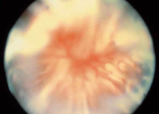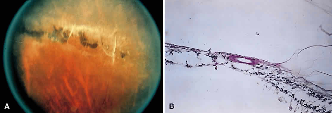 In very long-standing RRDs, extensive capillary nonperfusion can result, leading to peripheral retinal neovascularization.95 Moreover, intraocular pressure can rise if the trabecular meshwork becomes impeded by pigment clumps or the outer segments of photoreceptors.96,97 PROLIFERATIVE VITREORETINOPATHY After RRD, proliferative vitreoretinopathy occurs in approximately 10% of cases, of which one quarter require additional surgical intervention.98,99 The severity can vary greatly.100 In its mildest form, the only findings are vitreous haze and pigment clumps (grade A). Moderate proliferative vitreoretinopathy (grade B) is manifested by early cellular proliferation, which may occur on either or both sides of the retina.101,102 The involved retina may become stiffened, and its surface may take on a wrinkled appearance. Also, the retinal vessels may become tortuous and the edge of the retinal break may become rolled. Finally, with severe proliferative vitreoretinopathy (grade C), full-thickness retinal folds (“star folds”) may occur (Fig. 12). In moderate to severe disease, the proliferative membranes are composed mostly of dedifferentiated RPE cells; nonetheless, glial cells, fibrocytes, myofibroblasts, and macrophages may also be present.103–105 Proliferative vitreoretinopathy is most likely to occur in the inferior retina, and it is postulated that RPE cells settle out of the vitreous onto the inferior retinal surface in a gravity-dependent fashion, where they eventually cause proliferative vitreoretinopathy.106 |