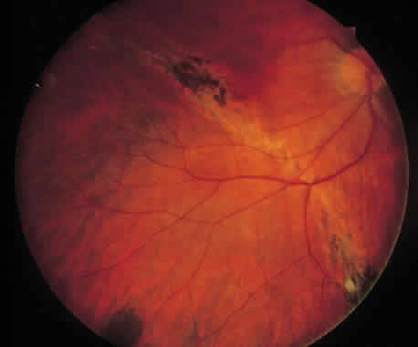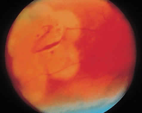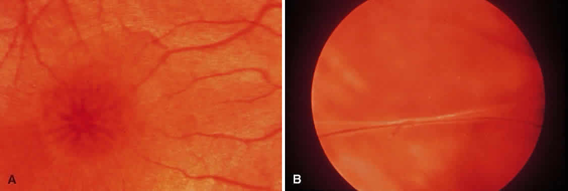 CONGENITAL (JUVENILE) RETINOSCHISIS. The presence of a characteristic spokelike pattern of foveal change alerts the examiner to this condition. In the peripheral retina, schisis tends to develop between the nerve fiber layer and the balance of the retina (Fig. 8). Holes commonly develop in the inner wall of these schisis cavities but are generally inconsequential. In contrast, holes in the outer wall of these cavities are rare but can lead to RRDs.28,85 EHLERS-DANLOS SYNDROME. This autosomal dominant condition is characterized by abnormal collagen throughout the body. These patients are predisposed to both myopia and RRD. GOLDMANN-FAVRE SYNDROME. This is an autosomal recessive condition in which cataract, peripheral and macular retinoschisis, radial lattice degeneration, accelerated vitreous syneresis, and retinitis pigmentosa-like peripheral retina changes are evident. These patients are prone to RRDs, which often prove difficult to repair. MARFAN SYNDROME. As with Ehlers-Danlos, there is an increased risk of myopia and lattice degeneration, leading to a high incidence of RRDs. When ectopia lentis is present, cataract removal is often associated with vitreous loss, which places these patients at an even higher risk for RRD. OTHER ABNORMALITIES. Patients with the so-called morning glory syndrome are predisposed to RRD because liquefied vitreous may pass through defects in the anomalous disc into the subretinal space. Likewise, tears present in choroidal colobomas may also cause RRD.86 |