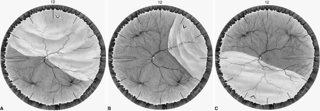 In 1971, Lincoff and Gieser93 reported four guidelines for locating retinal breaks causing RRDs. The propagation of an RRD is determined by the location of the causative break, anatomic barriers (i.e., the optic nerve, the ora serrata, and existing chorioretinal adhesions), and the effect that gravity has on the subretinal fluid in the upright position (Fig. 10):