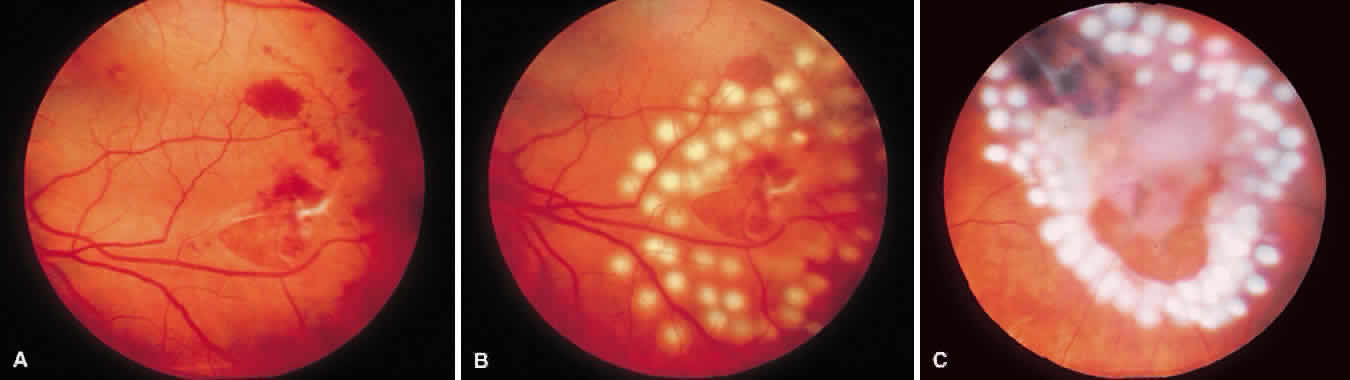 Laser photocoagulation, administered with either a slit-lamp or indirect