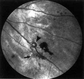 The new vessels, initially naked, usually progress through a stage of further proliferation with associated connective tissue formation. As PDR progresses, the fibrous component becomes more prominent. Fibrotic tissue can be vascular or avascular. The fibrovascular variety is usually found in association with vessels extending into the vitreous cavity or with abnormal new vessels on the surface of the retina or disc. The avascular variety usually results from organization or thickening of the posterior hyaloid face. Posterior vitreous detachment in diabetics is characterized by a slow, overall shrinkage of the entire formed vitreous rather than by the formation of cavities caused by vitreous destruction.14 Davis15 has stressed the role of the contracting vitreous in the production of vitreous hemorrhage, retinal breaks, and retinal detachment. Neovascular vessels do not “grow” forward into the vitreous cavity; they are pulled into it by the contracting vitreous to which they are adherent (see Fig. 11). Vitrectomized eyes rarely develop new areas of neovascularization and existent neovascularization tends to regress. If severe enough, posterior vitreous detachment may result in retinoschisis, retinal detachment, and retinal break formation. In eyes fortunate enough not to develop these complications, the neovascularization may burn out, leading to atrophy of the new vessels. An additional complication of contracting vitreous is traction involving the optic nerve that causes stria of the macula or even macular heterotopia (Fig. 13)20; both may cause decreased visual acuity.