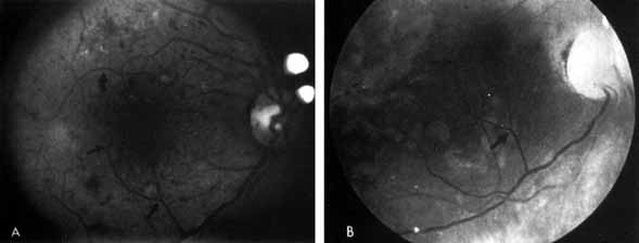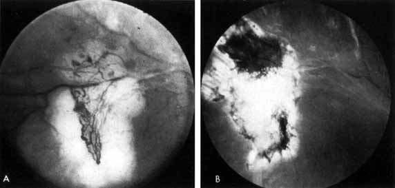 In combined traction/rhegmatogenous detachment, the borders of the elevated retina usually extend to the ora serrata; the retinal surface is dull and grayish and undulates because of retinal mobility caused by shifting subretinal fluid. The causative retinal breaks are usually found in the posterior pole near areas of fibrovascular proliferation. They are oval in shape and appear to be partly the result of tangential traction from the proliferative tissue as well as vitreous traction. Determining the location of retinal holes may be complicated by many factors, particularly poor dilation of the pupil, lens opacity, increased vitreous turbidity, vitreous hemorrhage, intraretinal hemorrhage, and obscuration of the breaks by overlying proliferative tissue. Often they are only located during vitrectomy surgery. |