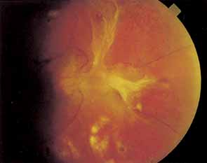 Cotton-wool spots, also referred to as soft exudates, are actually nerve fiber layer infarctions. They are white, fluffy-appearing lesions in the nerve fiber layer that result from occlusion of precapillary arterioles. Fluorescein angiography confirms the lack of capillary perfusion. Microaneurysms frequently surround older cotton-wool spots as well as larger areas of capillary nonperfusion. Venous beading (see Fig. 7) and venous loops (see Fig. 8) indicates sluggish retinal circulation and are nearly always adjacent to extensive areas of capillary nonperfusion. Focal vitreous traction is thought to contribute to their formation.9 Capillaries next to areas of nonperfusion that dilate and function as collaterals are referred to as IRMA. They are frequently difficult to differentiate from surface retinal neovascularization. Fluorescein, however, does not leak from IRMA but leaks profusely from neovascularization (see Fig. 7). The Early Treatment Diabetic Retinopathy Study (ETDRS)10 found that IRMA, multiple retinal hemorrhages, venous beading and loops, widespread capillary nonperfusion, and widespread leakage on fluorescein angiography are all significant risk factors for the development of proliferative retinopathy. Interestingly, cotton-wool spots, in the absence of the other findings, are not. Approximately 50% of patients with severe NPDR progress to proliferative retinopathy with high-risk characteristics (discussed later) within 1 year.11 PROLIFERATIVE DIABETIC RETINOPATHY Proliferative vessels usually arise from veins and often begin as a collection of fine vessels. When they arise on or within 1 disc diameter of the optic disc they are referred to as neovascularization of the disc (NVD) (Fig. 9). When they arise further than 1 disc diameter away, they are called neovascularization elsewhere (NVE) (Fig. 10). NVE nearly always grows toward and into zones of retinal capillary nonperfusion, but capillary nonperfusion is nearly always more widespread in eyes with NVD than it is in NVE.12 Interestingly, it is seen more often in patients younger than 40 compared to older patients with diabetes.13 Once the stimulus for growth of new vessels is present the vessels grow along the path of least resistance. The absence of the internal limiting membrane over the optic disc could explain the proclivity of new vessel growth at that location. Neovascularization grows readily along connective tissue scaffolding such as the posterior hyaloidal face (Fig. 11).