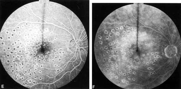 To prevent new areas of neovascularization, several ophthalmologists began to photocoagulate not only neovascularization but all intraretinal hemorrhages as well (“shoot the red”), on the grounds that they represented areas of hypoxia that could later develop into proliferative retinopathy. They soon noted that the cases that had the most intraretinal hemorrhages and therefore received the most initial photocoagulation frequently had the best long-term results, with permanent regression of neovascularization (Fig. 20). In such cases, the optic disc often became pale, indicating optic atrophy.